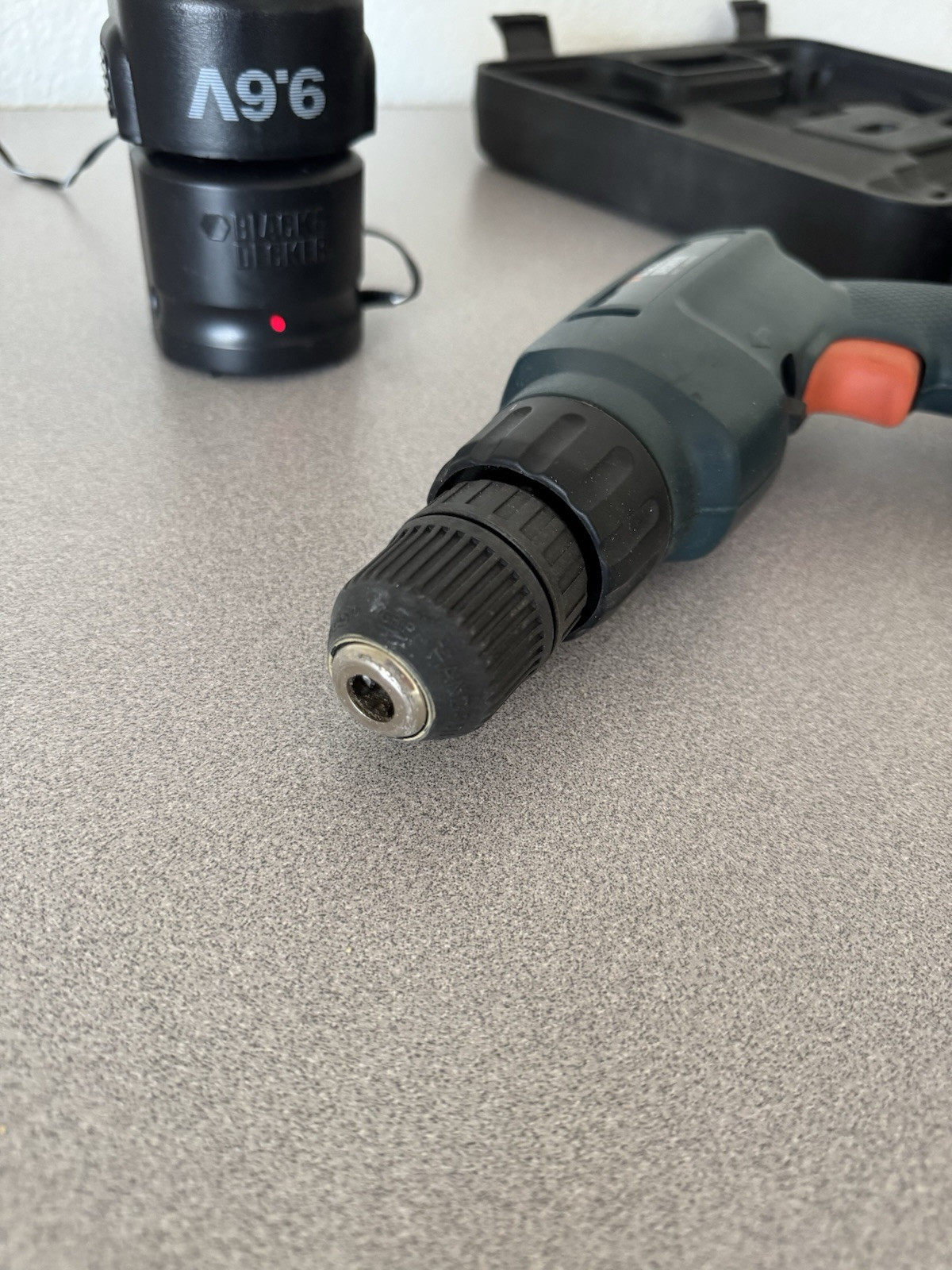 Black & Decker 9.6V drill with battery, charger and carrying case. All in great, working condition.