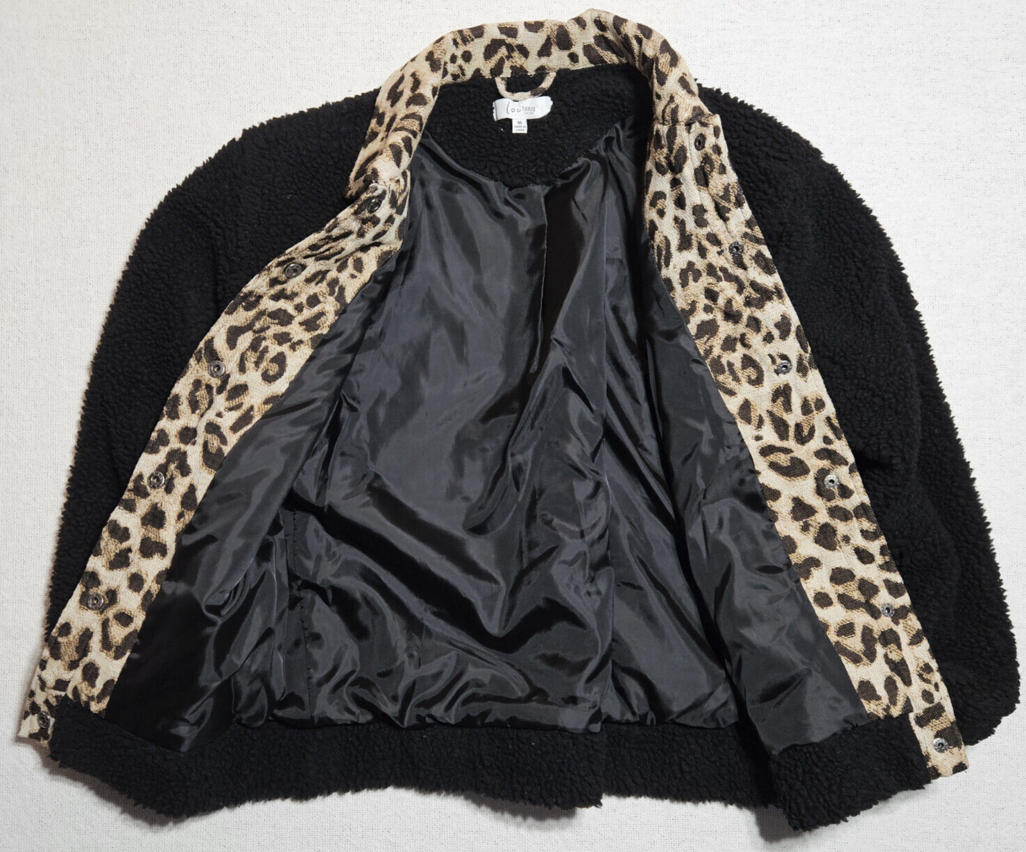 The Louna Black Faux Fur Sherpa Leopard Trim Jacket in Women's XS is a stylish and versatile outerwear piece perfect for various occasions such as travel, parties, casual wear, and work. Made of polyester with a fleece fabric type, this mid-length jacket features a snap closure, collared neckline, and pockets for added convenience. The animal print pattern with leopard trim accents adds a trendy touch to the classic fit design. Ideal for winter, fall, and spring seasons, this jacket is easy to care for with machine washable instructions. Perfect for those looking for a chic and cozy addition to their wardrobe.