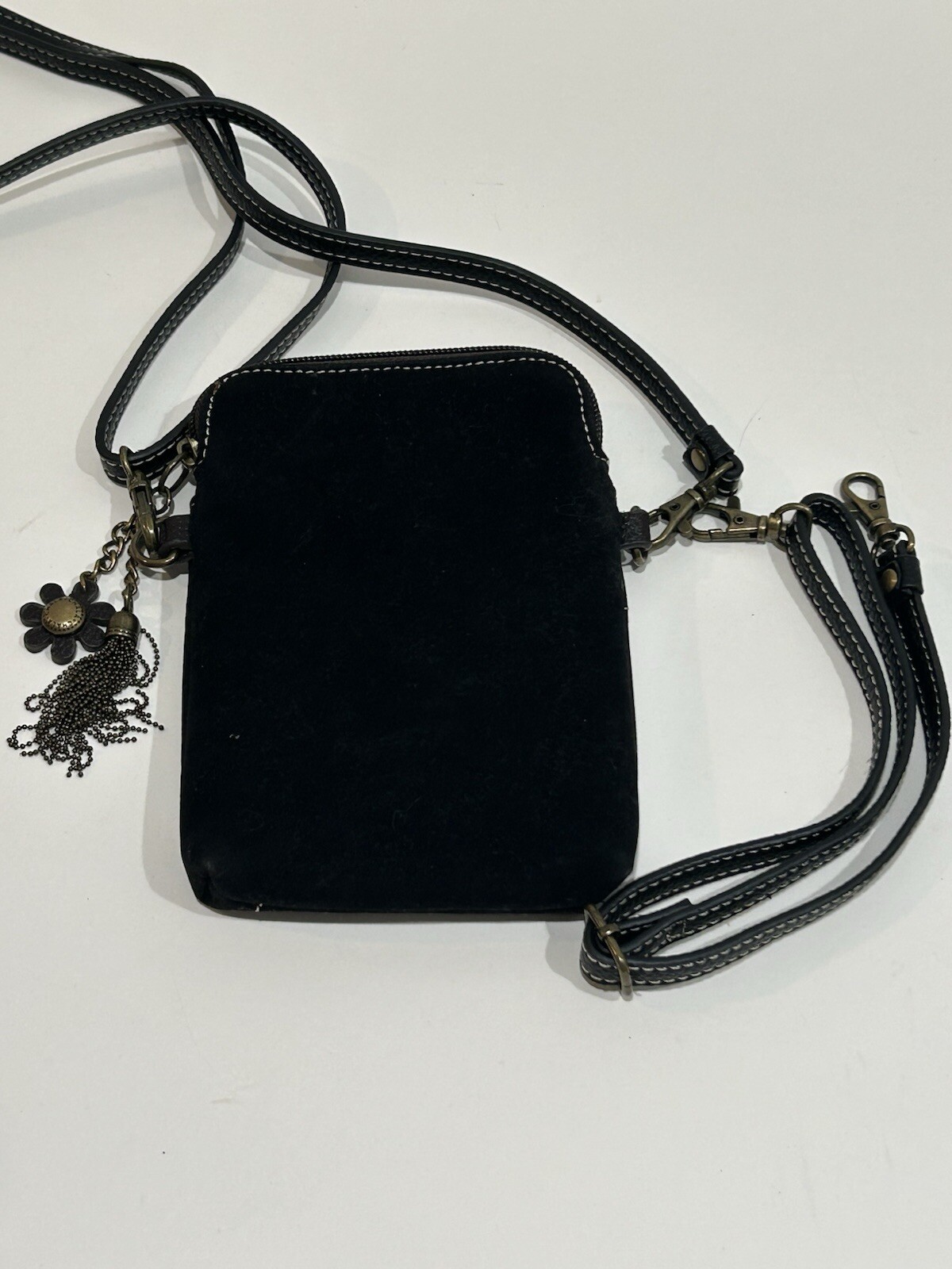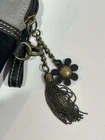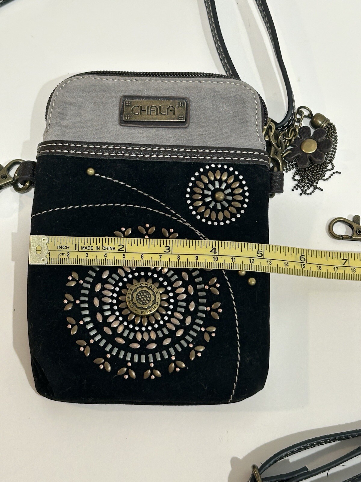 This is a Chala crossbody purse in black and gray, featuring a studded design with a floral pattern of daisies. The bag is small in size, with a rectangular shape and a zip closure. It includes accessories such as a key chain, detachable strap, and bag charm. The bag has outer pockets, a lined interior with a mobile phone pocket, and an adjustable cross-body strap. Perfect for travel, casual outings, or workwear.