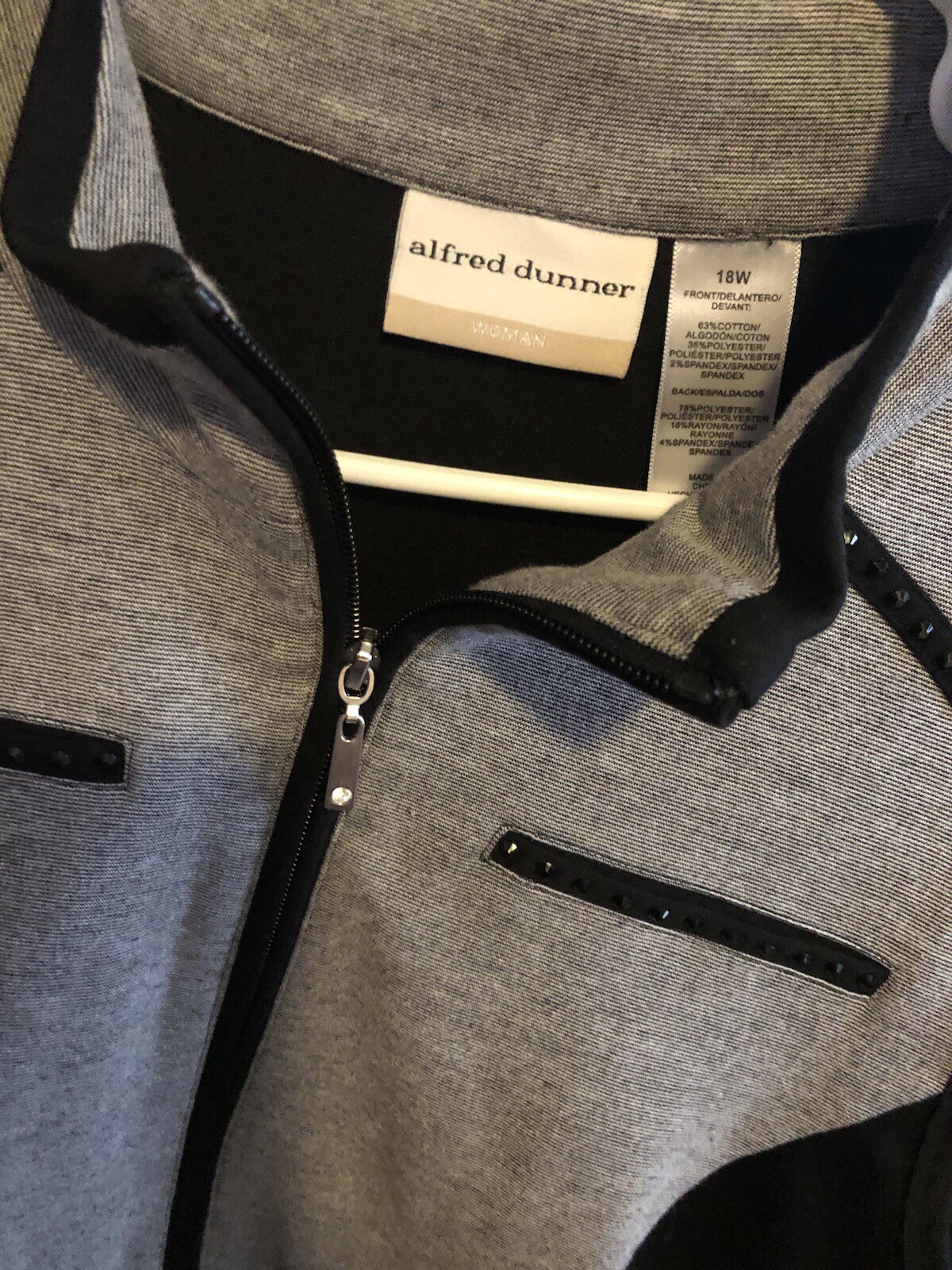 This black and grey Alfred Dunner vest in size 18W is a stylish and versatile piece for casual occasions. Made from a cotton blend knit fabric, it features a zip closure and studded accents for added detail. Machine washable for easy care, this basic jacket is perfect for women looking for a comfortable and fashionable layering option.