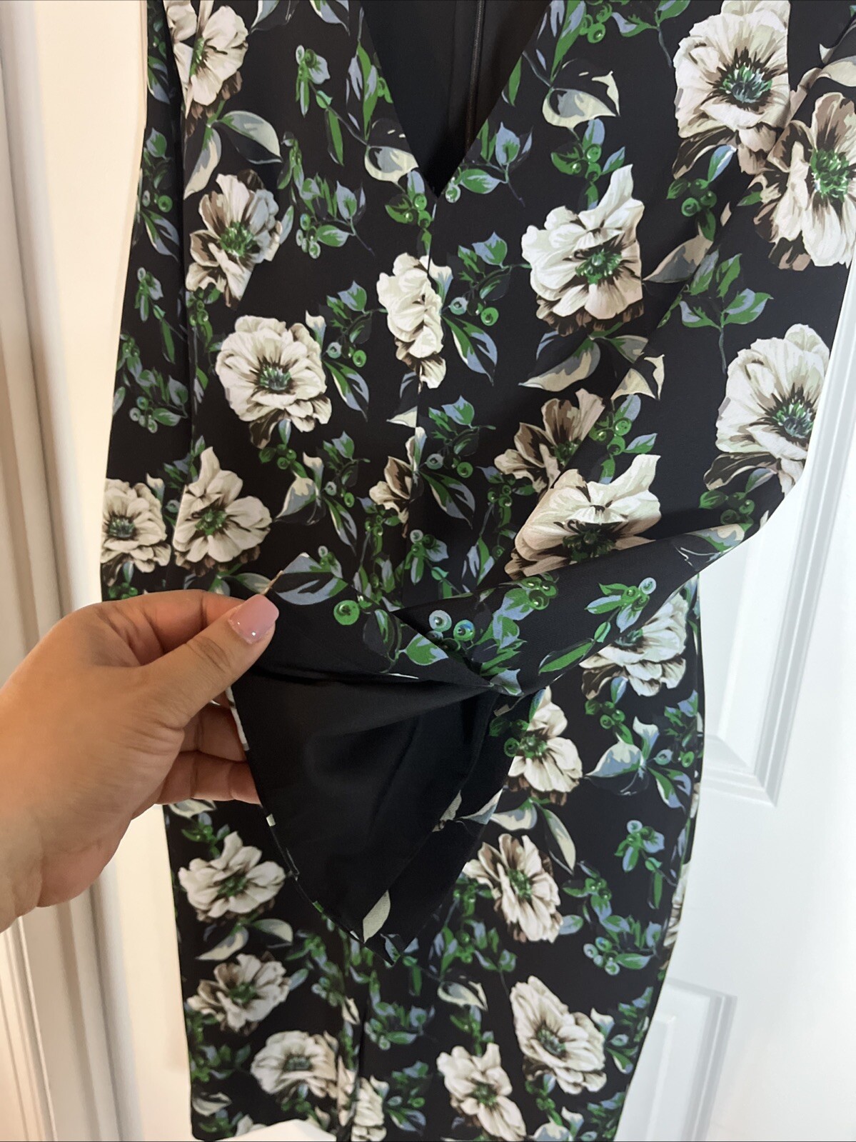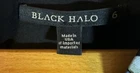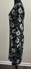 The Black Halo Black Floral Sheath Dress in size 6 is a stylish and versatile option for various occasions such as weddings, parties, or even a Holy Communion. This dress features a beautiful floral pattern on a black velvet fabric, with a flattering V-neckline and long sleeves with slit details. It has a zip closure at the back and is lined for added comfort and stretch. Made in the United States, this midi-length dress is perfect for all seasons and is sure to make a statement with its elegant design and high-quality materials.