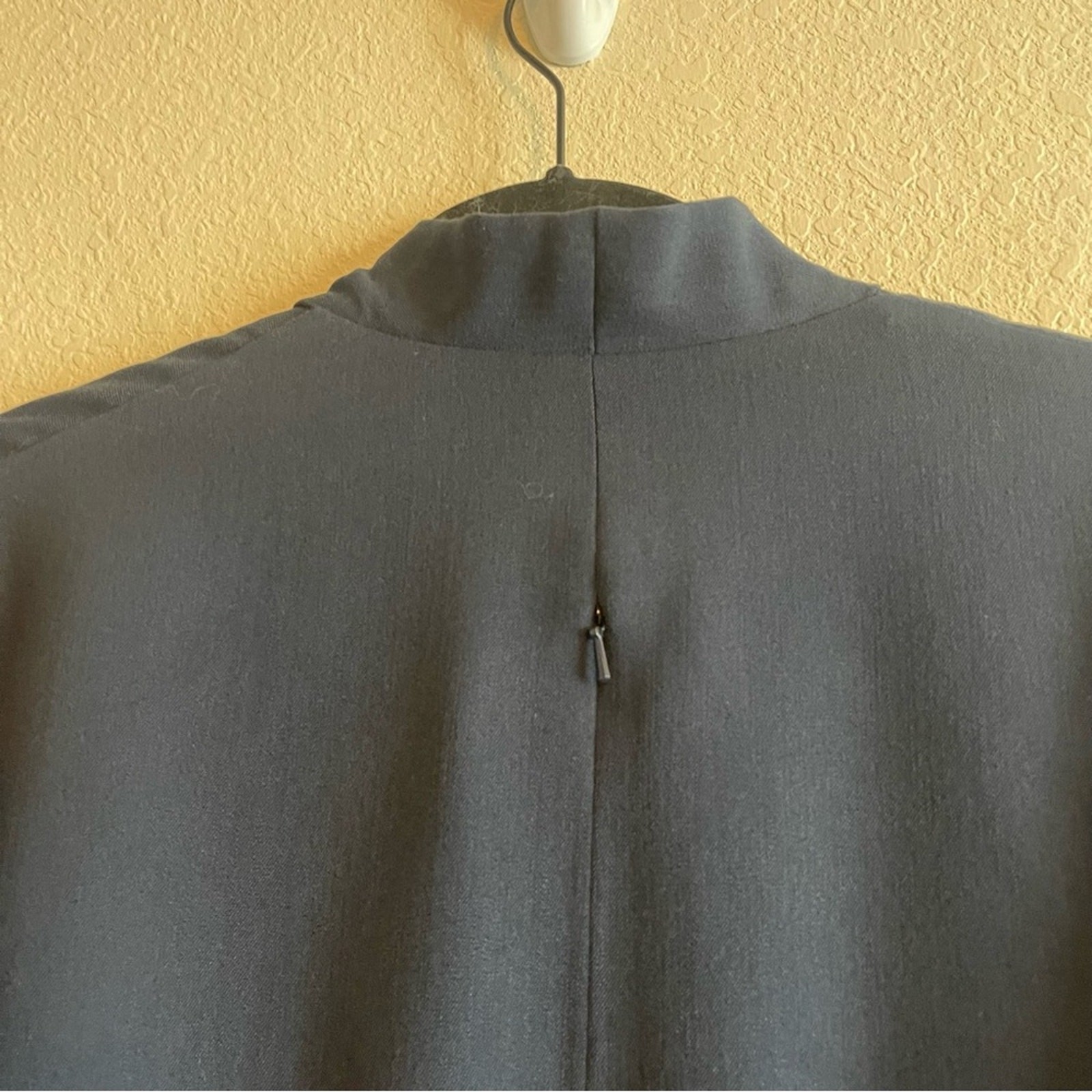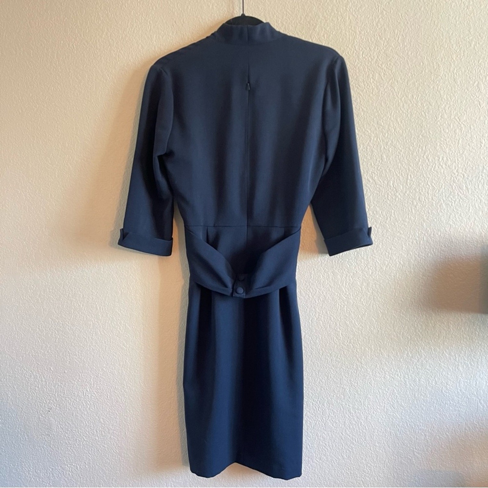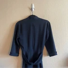 Black Halo Navy Blue Sheath V Neck Collared Twist Front Dress Womens Size 8 This item is in great preowned condition, cute, trendy. Lined, v neck, 3/4 length sleeves, twist front. Zipper closure. Women's Size 8 Approx Measurements: Pit to Pit: 18 in Length: 39 in