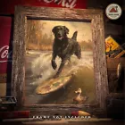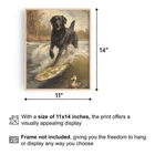 This vintage art print depicts a black Labrador dog surfing a wave. The artist, Apple Creek Publishing, created this small portrait-oriented print on paper with a handcrafted touch. The print is a licensed reprint of an artwork dating back to 2023 and does not come with a certificate of authenticity or framing. The print's style and theme are perfect for art collectors and enthusiasts who love vintage hunting art. The print's dimensions are 14 inches in height and 11 inches in width, listing it under the categories of art prints and art. This single piece print is perfect for those who want to personalize their own frame and display it in their homes or offices.
