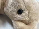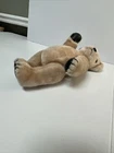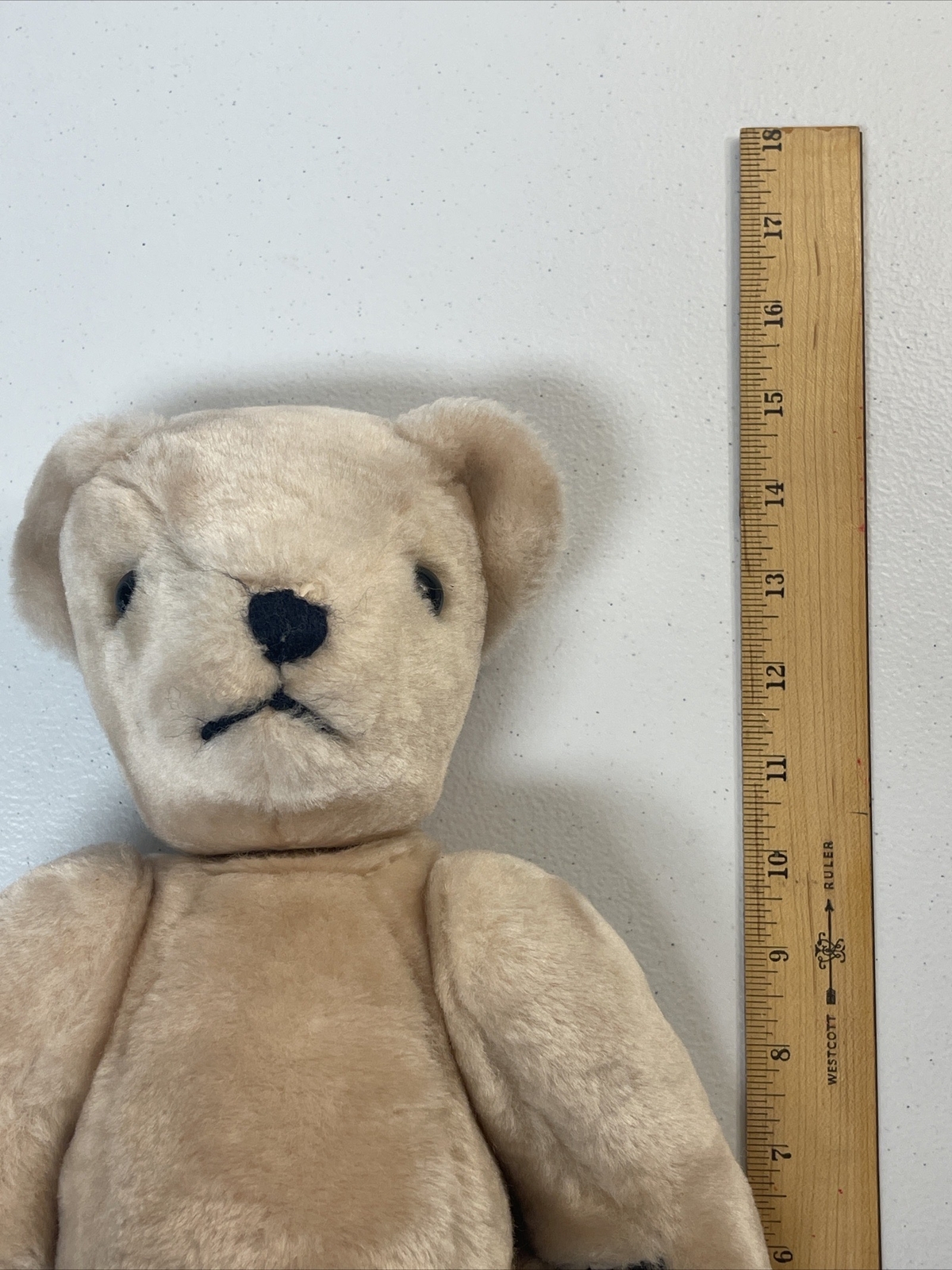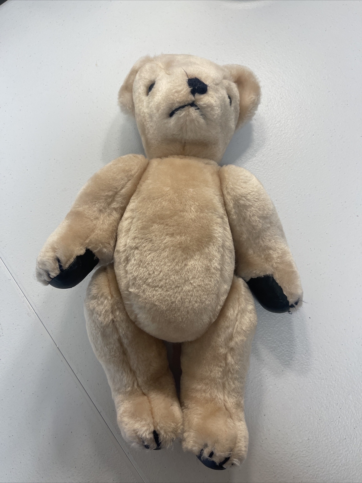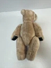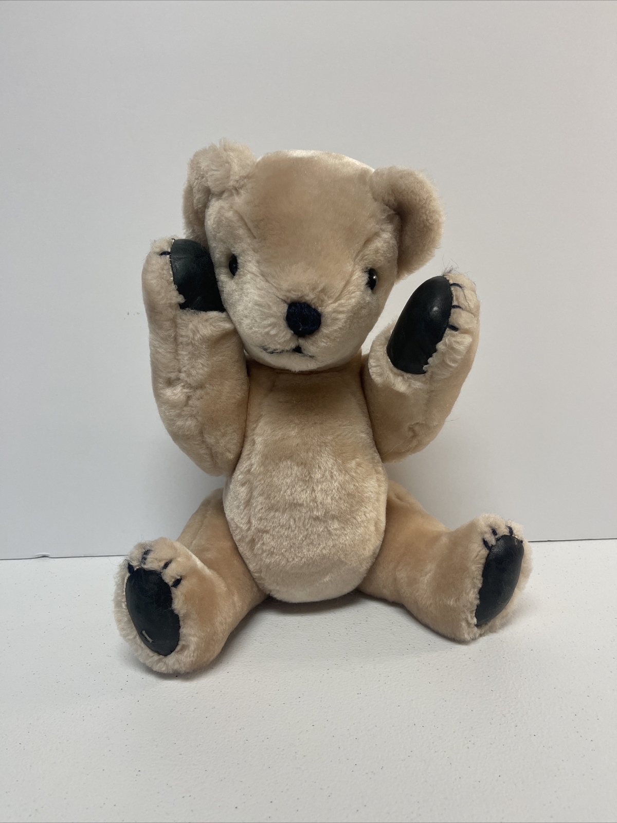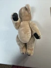 Bear Plush 14 inch Jointed Arms Legs Swivel Head Tan with Black Leather Paws I cannot confirm that the black is leather, could be faux leather. Head turns all the way around. Arms and legs also can go a complete turn. Would be nice for a child who wants to dress a bear, or use it as a patient to play doctor.