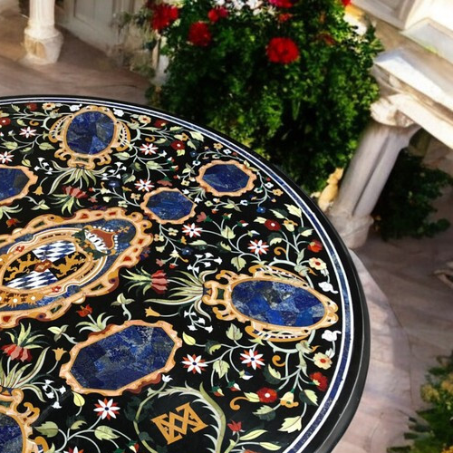 Product Information Size: 24"x24" Inches Shape: Round Color: Black Thickness: 10-20 mm What is Inlay Art? One of the most attractive work of art that comes from marble is"Marble Inlay" work. It is the same work that adorns the Taj Mahal and other Mughal monuments. It is a closely protected traditional art and only a few expert exponents are available today. The delicate process involves cutting and engraving marble shapes manually. To start with, a predefined pattern e.g., floral design or geometrical design is engraved on the marble slab. Small pieces of marble of different shades are cut delicately to fit in these grooves precisely. These small pieces are then slipped in the grooves. Apart from marble, many other materials can also be used. History Of Inlay Art Inlay work on delicate precious stone began in the workshops of Florence in Italy around the end of the 16th century. This was known as PIETRA DURA.(Pietra= Stone, Dura= Hard) The Italians had created a classic artistic form and held a monopoly over it. From 1630 onward pietra dura appeared on movable, small objects as decorative panels, with bird and flower motifs, suitable for cabinet fronts and table tops. Some of these soon reached the Mughals in the form of presents. Of all the Mughal Emperors, Shah Jahan was the greatest patron of architecture in India. For him no amount of money or time was too much to create enduring, everlasting architectural beauty and through it be remembered always. It is in his buildings that one feels most compelled to make the connection between Mughal art and pietra dura. The Taj Mahal, the cenotaphs of the Emperor and his wife, the main floor and the surrounding marble railings bear very close resemblances to the pietra dura form. Process of Marble Inlay Art Master Craftsman carefully plans a design, which is etched lightly into the marble surface and later scored out with an iron chisel. Many of the tools of the trade are basically the same as those used by the Mughals hundreds of years ago. He then decides on the colour scheme depending on the requirements of piece being created. Semi-precious stones and gems are expertly chosen to give just the right graduation in colour and shade for the overall radiance of the pattern. They are shaped and polished by means of an emery wheel. Sometimes heat treatment is applied to certain stones to get a shading effect. The effort involved in making just one single flower can often take days of work, depending on the detail; it is not unusual to be designed from hundreds of different slices of stone. There are many varieties of coloured stone available for utilisation in marble inlay work: malachite, cornelian, jasper, mother of pearl, abalone shell, lapis lazuli, agnate, coral, turquoise and tiger eye to name just a few. The grooves are filled with their precisely corresponding shapes of coloured stone and secured in place with a white putty made from oil, and wax. Once the design is completely dry, the piece is polished with a mixture of sand, water and emery paper to give a shiny smooth finish. This is only table top leg is not included. Thanks For Visting ~~~~