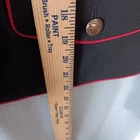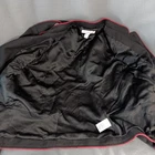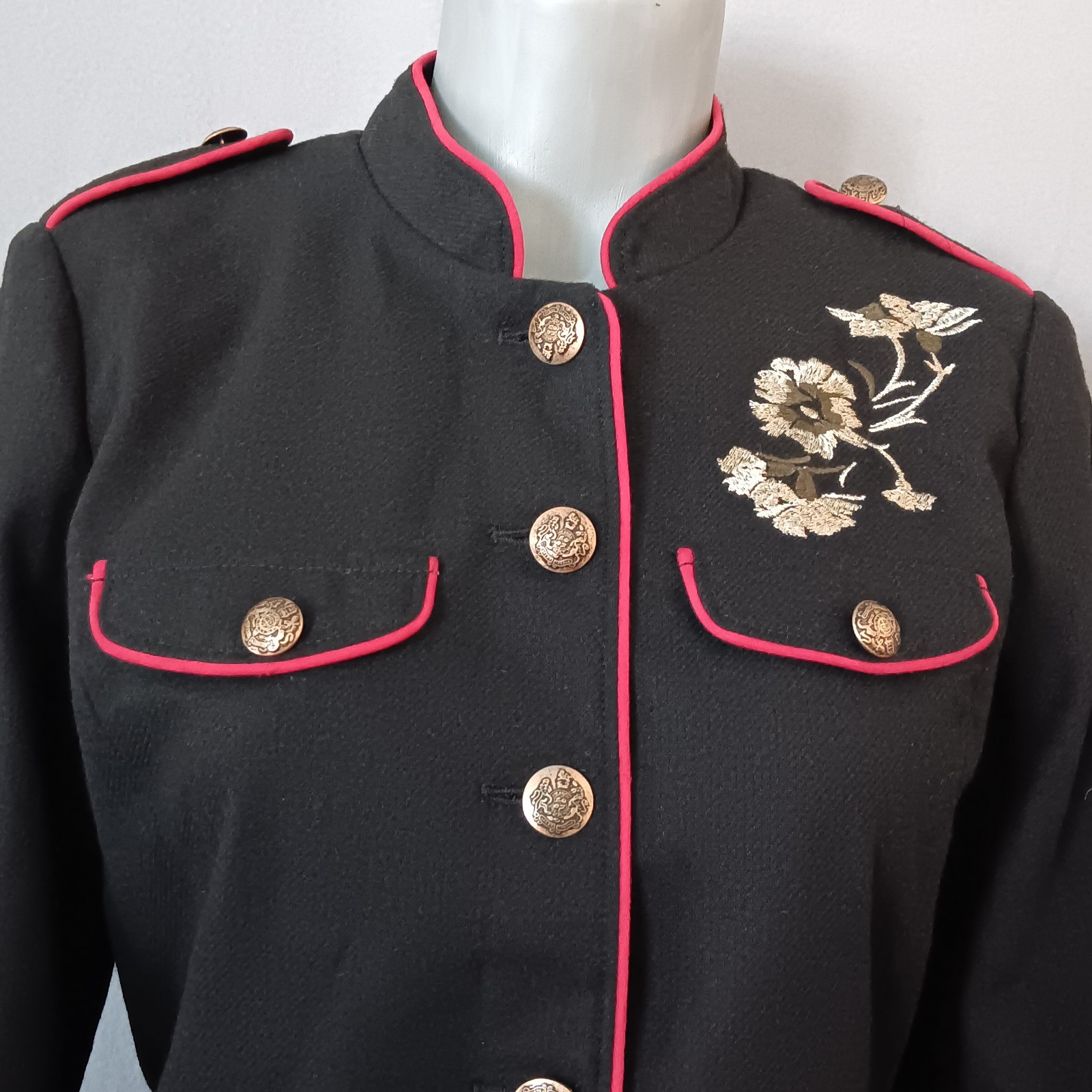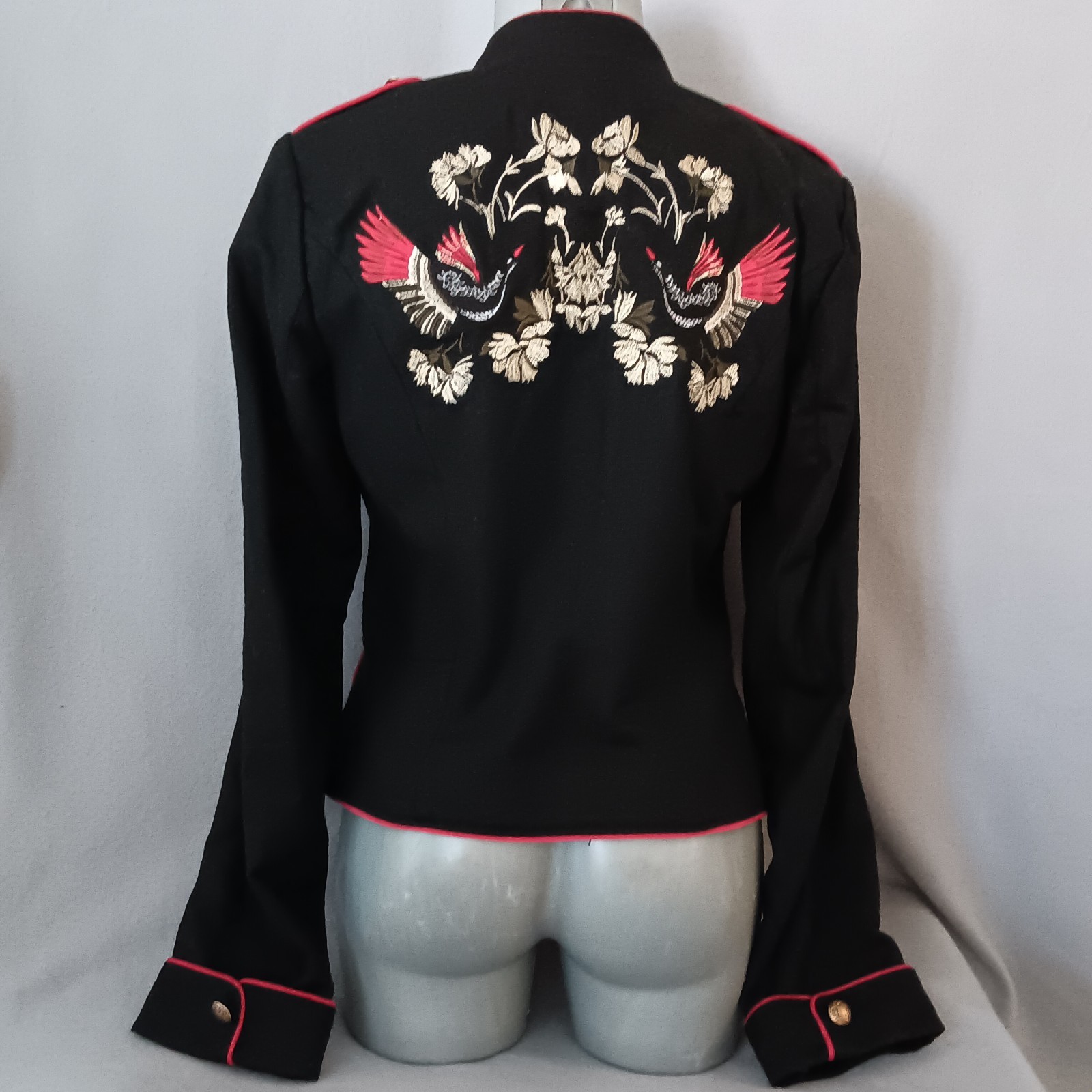 Statement Black Military Style Jacket Swan Floral Embroidery Steampunk Gruge Artsy Size Small new without tags. Features a unique design with a structured tailored fit and a stand-up Mandarin Style collar. Accents include contrasting bright red piping outlines the jacket edges collar and cuff. There are ornate gold tone buttons and a beautiful flower, and Swan embroidery. It is black satin lined. Please see the photos attached for details. The measurements are in the photos. This jacket comes with two extra buttons.