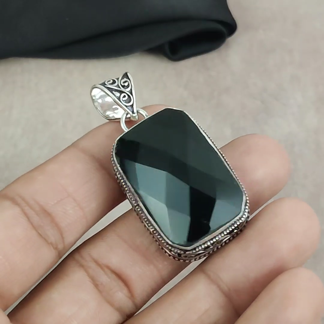 Secondary Stone:N/ATheme:Beauty, Bohemian, Ethnic, Halloween, Love, NatureStyle:PendantMetal:Sterling SilverBase Metal:Sterling SilverMain Stone:Black OnyxFeatures:HandmadeMain Stone Creation:NaturalColor:SilverNecklace Length:5"Main Stone Color:BlackCountry of Origin:IndiaMain Stone Shape:EmeraldDiamond Clarity Grade:N/ATotal Carat Weight:10 carat and aboveMaterial:GemstoneCertification:N/ACollection:HandmadeMain Stone Treatment:Not EnhancedDiamond Color Grade:N/AClosure:Same As PictureNumber of Diamonds:N/ABrand:HandmadePendant Shape:Same As PictureCut Grade:N/AColored Diamond Intensity:N/APendant/Locket Type:Same As PictureSetting Style:BezelMetal Purity:925Occasion:Anniversary, Birthday, Christening, Christmas, Engagement, Father's Day, Graduation, Mother's Day, Valentine's Day, WeddingNumber of Gemstones:1Country/Region of Manufacture:IndiaType:PendantChain Type:N/A