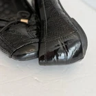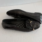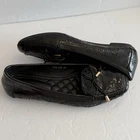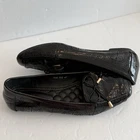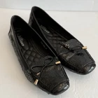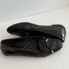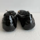 Step out in sleek sophistication with these Jiasuer black patent flats. Featuring a quilted cushioned insole, elegant bow accent with gold-tone tips, and a glossy patent finish with embossed design, these shoes deliver both comfort and style. Perfect for work, casual wear, or pairing with dressy outfits. Details: • Brand: Jiasuer • Style: Patent Quilted Flats / Ballet Shoes • Color: Classic Black with Bow Accent • Women’s Size: 41 (fits approx. US 9-9.5) • Upper: Shiny Patent with Embossed Pattern • Insole: Quilted Cushioned for Comfort • Sole: Durable rubber sole with traction • Condition: Preloved Charm – gently worn with light signs of use (see photos), cleaned and ready to wear