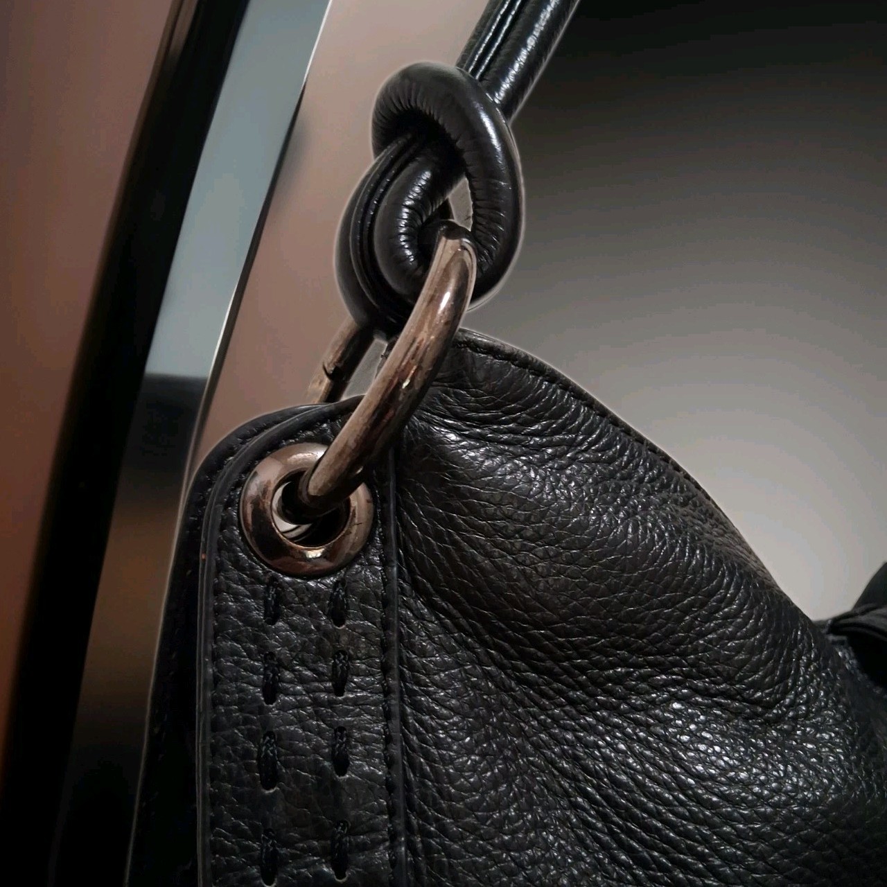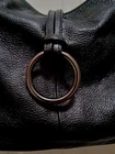 The Black Pebbled Faux Leather Tote Bag is a stylish and spacious hobo shoulder bag perfect for travel, casual outings, and business meetings. The rectangular shape and large size make it versatile for carrying essentials while the black exterior and gunmetal O Ring accents add a touch of sophistication. The pebbled finish and decorative stitching give it a unique and trendy look, while the zip closure, lined interior, and inner pockets, inner zipper compartment and inner zipper divider provide practicality and organization. The split top handle and simulated leather material make it comfortable to carry, making it a must-have accessory for any woman on the go. Excellent Condition, please refer to pictures for condition details.