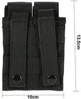 Store Categories Store Categories US STOCK Hunting Holster Concealed Carry Tactical Holster Bags and Pouch Tactical Bags Molle Pouches Magazine Pouch Wallets Key Bag Hats Hunting Accessories Gun Slings & Belts Laser and Riflescopes Other Black Pistol Molle Double Mag Pouch Single and Double Stack Magazine Holster Product Description About this item: This pistol mag pouch can holds two double-stack or single stack pistol magazines in 9mm .40 and .45 caliber. like Glock, M1911, P226 and 92F magazines, etc. Made of high quality military 600D nylon material, tear-resistant, wear-resistant. The adjustable top hook-and-loop flap closure securely keep the mags in place. And a steel drain hole rivet in the bottom. There is buckle strap on the back allow you to add the military pistol pouch to belt, combat vest, tactical backpack, or other MOLLE compatible gear. The tactical Pistol Magazine pouch provides optimal storage for most pistol magazines. It can also be used to store folding knives, multi-tools, flashlights, and other small essentials. Description Single pouch size: 14cm x 5.5 cm(approx.) Double pouch size: 14cm x 10cm(approx.) Available colors: Black Package Included: 1 x molle pouch Payment Policy Shipping Policy Returns Policy Payment Policy Item will be shipped within 1-3 working days after payment received. Free USA Shipping:USPS or UPS. Express Delivery: 1-7 wor king days to arrive. Shipping Policy 1.We fully guarantee our items. All items are in brand new condition unless specified otherwise elsewhere in the description. 2.All returns - defective or otherwise - have to be preauthorized. Please contact us to get an authorization and returning address before sending the item back. 3.All returned items must include original packaging and all accessories. 4.Buyers are responsible for the shipping cost of returning or re- s e nding items. Returns Policy Our office hours are: 9:00 a.m. to 6:00 p.m. (GMT+8),Monday to Friday. Our office is closed on weekends and public holidays. Message replyin g will sometime s be delayed. If you have any question or needs, please let me know.We will reply to you ASAP. Copyright © 2023 Dianxiaomi