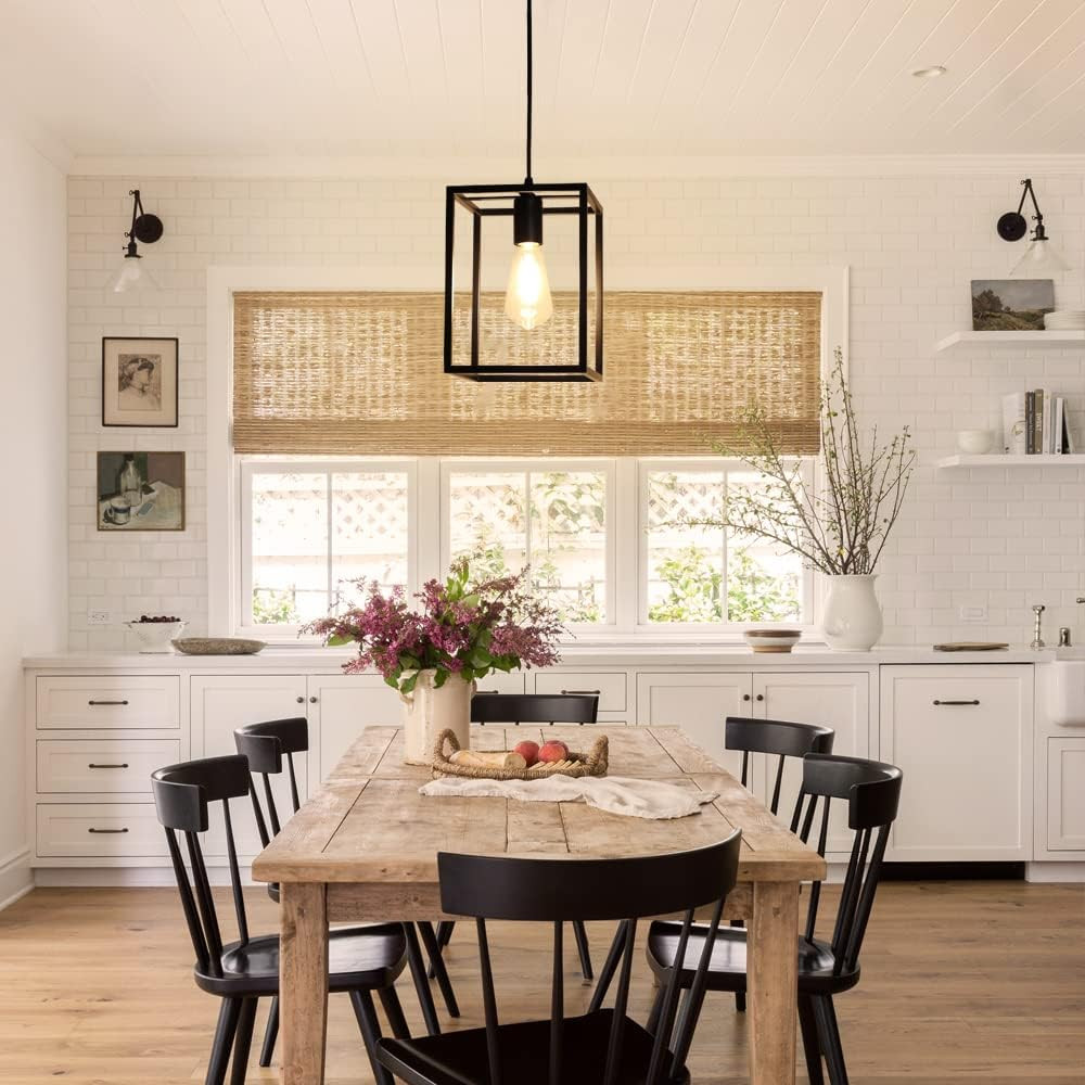 【Farmhouse Rustic Chandelier】 Hanging black chandelier features a geometric metal lantern caged frame and the open air design. Not only easy to create a retro farmhouse atmosphere but also let you friends feel welcome into your home. 【One Bulb Requirement】 Hallway pendant light fixtures works well with various of E26 light bulbs (Max:60W), like incandescent, LED, CFL and halogen bulbs. Fully dimmable when using dimmable bulbs and compatible dimmer switches. (BULB NOT INCLUDED) 【Height Adjustable】 Equipped with 55.11" cord. The length can be adjusted according to your preferences and design. Adjustable boom makes this fixture suitable for most ceiling heights. 【Wide Application】 The black entryway light can install on slop /Flat ceiling also a perfect choice for your dining room ,kitchen island, living room, foyer, entryway to create a beautiful lighting in your room. 【Easy to Install & Assurance】 Kitchen island hanging lighting comes with all mounting hardware for quick and easy installation. Can be widely installed on a slanted/sloped or ceiling. If you have any questions, please feel free to contact us.