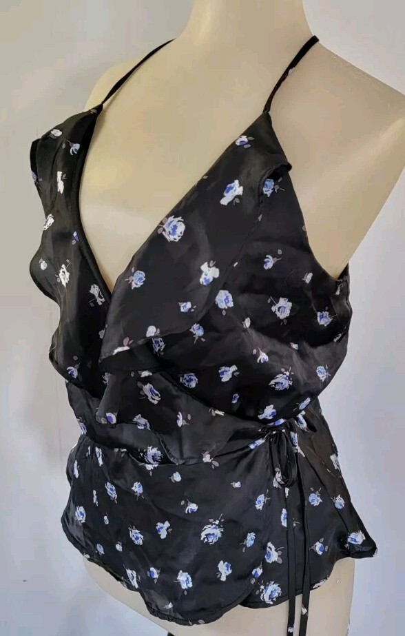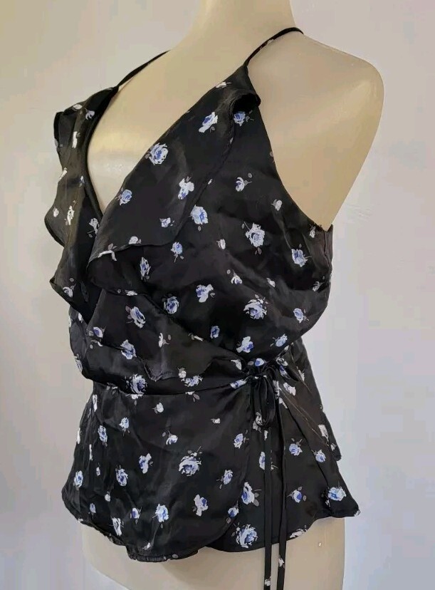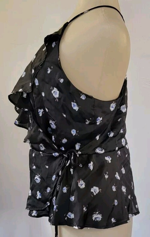 This black satin ruffled blouse is a stylish and lightweight option for casual occasions in the summer, fall, or spring. The V-neckline and tie closure add a unique touch, while the blue roses design, and wrap and tie closure give it a feminine and floral look. The sleeveless design with spaghetti straps and y-back accentuates the breathable fabric, making it a comfortable and trendy choice for women's closet. Perfect for adding a touch of romance to your outfit while maintaining a regular fit for a flattering silhouette.