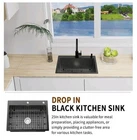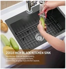 This item is new and complete, unused! Black Kitchen Sink,25x18 Inch Kitchen Sink Stainless Steel Drop In Kitchen Sink Topmount Stylish and Modern Look Sink With Bottom Grid,Drain Basket And Drain Assembly Add Elegance & Enhance Usability About: *Single Bowl Kitchen Sink: 11 gauge 25in black kitchen sink come with stainless steel bottom grid, collapsible strainer baskets and drain assembly, offering additional functionality and convenience to your kitchen. 25x18 inch black kitchen sink with nice accessories can serve as a statement piece and enhance the overall aesthetics of the kitchen. *Usability and Functionality: With exterior dimension-25"Wx18"Lx9"D , interior dimension-23"Wx14"Lx9"D, black stainless steel sink provides ample room for various kitchen tasks including washing dishes, food preparation, and cleaning larger cookware, while still leaving enough workspace on the countertop for food preparation and other activities. 25x18 inch size is suitable for most households and kitchens. *X-Shaped Bottom Design: The X-shaped bottom of stainless steel 25 inch kitchen sink creates channels or grooves that help direct water towards the drain more effectively, compatible with US standard drain assembly reduces the amount of time needed for the topmount kitchen sinks to dry after use and helps maintain better overall kitchen sink drainage. *Surface Technology: Made from stainless steel with brushed finish and nano coating, black kitchen sink is built to last. Surface technology of ss kitchen sink resistant to corrosion, stains, and scratches, ensuring its practicality even with heavy daily use. Anti-condensation spray undercoating also helps prevent condensation buildup on the underside of the sink. *Versatile Design: Black topmount kitchen sink could complement a wide range of kitchen decor styles, blending seamlessly with modern, minimalist, industrial, or even traditional kitchen designs. Drop in kitchen sink work well with both light and dark countertops. 25x18 inch size provides a substantial sink space while still maintaining a manageable footprint.
