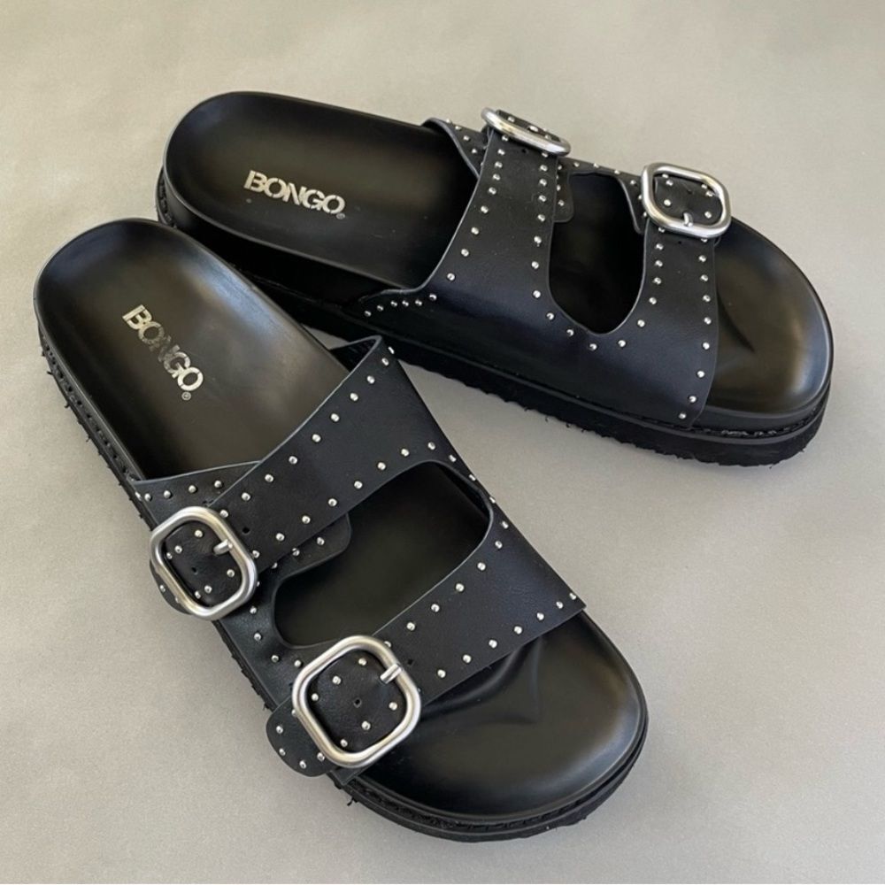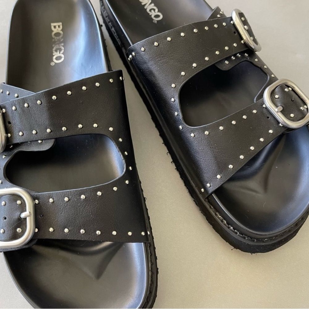 The BONGO BLACK SLIDES in size 8 are a stylish pair of sandals for women. These slide sandals feature a solid black color with studded accents, perfect for adding a punk-inspired edge to your outfit. The sandals have a buckle closure and an adjustable strap for a comfortable fit. Made of faux leather, these flat sandals have a trendy design that is both fashionable and versatile. Ideal for casual wear, these BONGO slides are a chic choice for those looking to add a touch of attitude to their look.