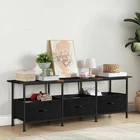 Black TV Stand for 55 inch TV, Farmhouse Entertainment Center with 3 Fabric Drawers, Industrial TV Console Table for Bedroom, Living Room 【Modern TV Stand with Storage】Our TV stand with its modern design and rustic black tabletop, can easily blend into a variety of interior design styles from farmhouse to industrial to modern and traditional spaces. The television stand is suitable for 50, 55, and 60 inch TVs (mainly depending on the actual length of the TV) Before placing an order, please make sure to check the size of your TV to match this TV entertainment center 【High-Quality Material】The entertainment center with storage function adopts high-quality MDF and a sturdy metal frame structure, which can withstand up to 160 pounds. The four adjustable feet design not only provides additional stability, but also protects your floor from scratches 【Ample Storage Space】TV stand for bedroom is equipped with 3 removable fabric drawers, as well as a spacious desktop, providing you with ample storage space for items. It is an ideal choice for living room bedroom storage. The dimensions of the drawer are " L x " W x " H 【Multifunctional TV Stand】The TV console table for living room is more than just a TV stand. Its versatility allows it to be used as a drawer cabinet, TV console and side table. Whether it is placed in the living room, office, or bedroom, it can perfectly fit into various spaces. This TV entertainment center is designed with the versatility of space in mind, making it a flexible furniture option that can meet your various needs 【Easy Assembly & Quality Service】The media console table detailed assembly instructions and all necessary accessories are provided. If you encounter any problems with the small TV stand, please our customer service team and we will help you within 24 hours to ensure your shopping experience is worry Features:The TV stand is made of MDF with natural wood grain and metal frames, offers stable support, and ensures s of use.Features three large non-woven synthetic fabric drawers, there is ample space for your game consoles, STBs, multi-media devices, and décor, making your living room more neat and organized. Equipped with flexible adjustable feet can compensate for any irregularities in the TV stand features three non-woven synthetic fabric drawers with a leather-like texture that is lightweight, breathable, and dustproof. Our entertainment center cannot only be used as a TV stand but also can be used as a kitchen bench for changing shoes or rest to relax the tired body and release fatigue.Specifications:Material: MDF, Metal FrameColor: BlackStyle: Mid-Century Modern RusticDimension: ” L x ” W x ” H, For 50, 55, and 60 inch TelevisionsPackage Includes: Rustic TV Stand ×1, User Manual ×1, Tool Kit ×1 .