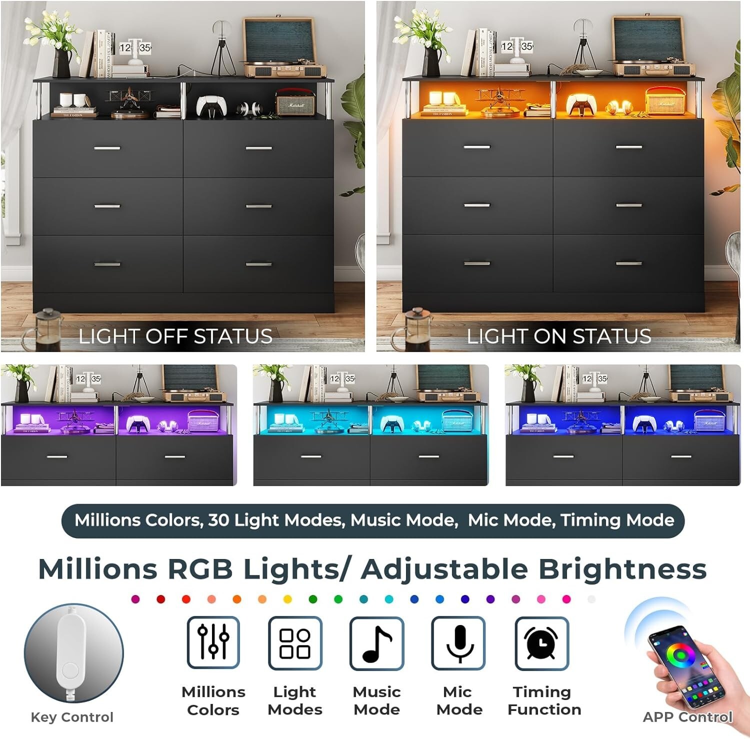 Product Description AOGLLATI Black Dresser with Column Design & Charging Station 2 AC and 2 USB sockets - One of USB ports is designed for the led lights, the AC socket and the other USB socket provide convenience for charging your phone, earphone, so the black dresser is convenient for any room, be it in the bedroom or living room. AOGLLATI Black Dresser with Adjustable Color & Brightness RGB Lights The RGB LED light strip can display a variety of colors and can be adjustable for brightness. In addition, there are several other lighting modes available to suit different moods and occasions. Moreover, there are a few songs on the app, and the led lights can change color with music rhythm. Previous page Next page Bedroom Living Room Small Room 2 Key Features for AOGLLATI Dresser for Bedroom Dresser with Charging Station This black dresser is arranged with 2 AC and 2 USB socket. One of USB ports is designed for the led lights, the AC socket and the other USB socket provide convenience for charging your phone, earphone, desk lamp, and other small electrical appliances. Dresser with Column Design This bedroom dresser is equipped with column design. 3 metal columns are designed in the bedroom dresser, and the clean and streamlined look makes this dressers for bedroom more attractive and unique. AOGLLATI 6 Drawer Dresser for Bedroom with Large Capacity Storage Cabinet This dresser completes with 6 big drawers, so lingerie, blankets, underwear as well as clothes of your family members can be stored well. The wood table top and the open storage are designed for simple storage, placing glasses, alarm clocks, table lamps, magazines, and even skin care products. AOGLLATI Bedroom Furniture Combinations and Substitutions Bed Frame with Column Design 6 Drawer Dresser 8 Drawer Dresser RGB Led Lights Million led colors can be changed according to your need. RGB Led Lights Million led colors can be changed according to your need. RGB Led Lights Million led colors can be changed according to your need. Column Design Design Column Design Design makes your bedroom more stylish. Column Design Design Column Design Design makes your bedroom more stylish. Column Design Design Column Design Design makes your bedroom more stylish. 4 Drawer Storage It can store many home stuffs, making your bedroom more tidy and comfortable 6 Drawer Storage It can store many home stuffs, making your bedroom more tidy and comfortable 8 Drawer Storage It can store many home stuffs, making your bedroom more tidy and comfortable AOGLLATI 6 Drawer Dresser with Column Design & Led Light for Bedroom