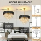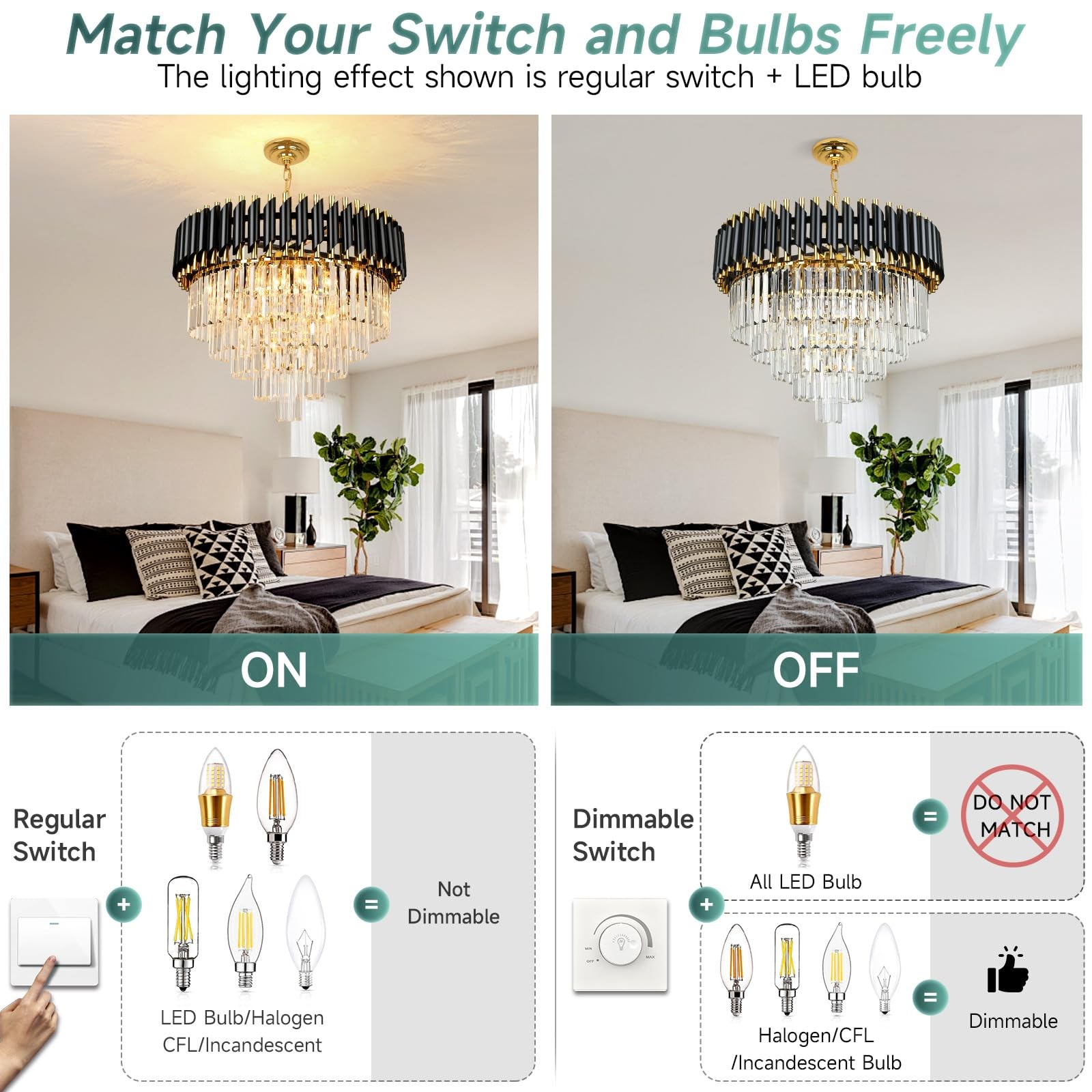 【Gold and Black Design】With a gold and black frame, it maintains a low-key appearance while still exuding luxury. Below, there are layers upon layers of clear and transparent crystals hanging. When illuminated, they emit a fascinating luster. There is no doubt that this chandelier will be the focal point of the entire scene. 【Multiple bulb options available】 - The E12 bulb sockets are compatible with various bulbs, including LED, CFL, and halogen bulbs (bulbs not included). Each bulb has a maximum wattage of 40W, and the input AC voltage is 85-265 V. (3-colour-changing LED bulbs are recommended.) 【Easy Installation & Height Adjustable】 - The living room chandelier requires assembly, but it's definitely worth the effort. The included mounting kit and detailed instructions enable quick and easy installation. The adjustable chain allows the chandelier to fit well on high ceilings or fairly low ceilings. 【Wide Application】 - The crystal pendant light has the effect of making the space appear more expansive, creating an open and relaxing atmosphere in the living room. It's perfect for living rooms, bedrooms, dining rooms, kitchen islands, foyers, hallways, etc. 【Packaging Upgrade】 - We use high-quality foam packaging, which enhances the stability of the internal packaging structure and greatly reduces the damage rate of the crystals. The hanging light has about 10% of the crystals as spare parts. If a large number of crystals are still damaged, please contact us.