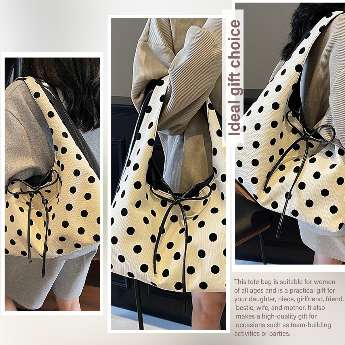 休闲包:这款手提包采用优质PU皮革制成,柔软;耐用;轻便。它给我们带来舒适的佩戴感,并且易于清洁。这款休闲包适合各种穿搭风格,功能多样。 它提供充足的空间,可存放雨伞、钱包、耳机、太阳镜、化妆品、手机等日常必需品。 用途广泛:波点设计;优雅的风格;顶部提手设计,多种背法。您可以将其用作流浪包、单肩包、手提包、托特包或钱包。 用途广泛:这款时尚的女士托特包配有肩带,可满足您的所有需求。它可以用作旅行包、健身包、瑜伽包、工作包等。非常适合日常休闲使用:海滩、派对、露营、度假、约会、日常通勤、派对或其他场合。 理想的礼物:这款托特包适合所有年龄段的女性。它是送给女儿、侄女、女朋友、朋友、闺蜜的实用礼物。妻子和母亲。在团队建设活动和聚会上,这款包也是送给每个人的绝佳礼物。