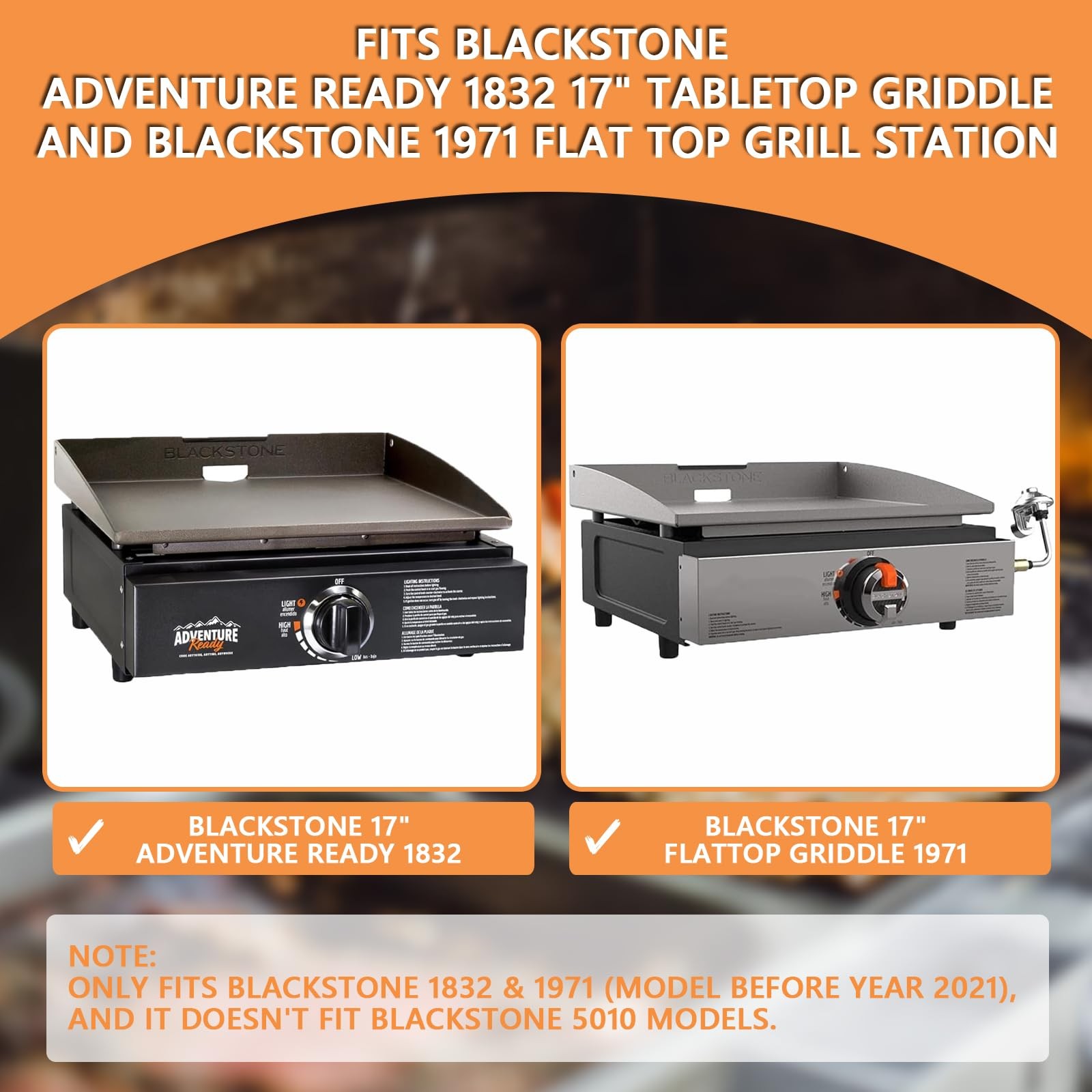 17 inch Griddle Lid for Blackstone 17 inch Griddle Hood 1832 Adventure Ready Tabletop Griddle, for blackstone tabletop griddle Blackstone 1971 17 inch Griddle Accessories,Blackstone 17 inch Hard Cover &Blackstone Lid Replacement The griddle lid with temperature gauge fit these Blackstone 17 inch grill Griddles: Hard cover for Blackstone Adventure Ready 1832 17 Inch Griddle; Hard cover for Blackstone 1971 Flat Top Grill Station Griddle. Specification: Package Includes 1-Pack griddle hood for Blackstone with temperature gauge and mounting screws.(Note: The screwdriver is not included). Material: It is made of high-quality black lacquered steel; Color: Black. Great for blackstone 17 inch hard cover, blackstone griddle cover 17 inch, blackstone 17 inch griddle hood 1832. Customized specifically for blackstone adventure ready 1832 17 inch tabletop griddle and blackstone 1971 grill lid(model before Year 2021). Plaease Note: The griddle lid only fits blackstone 1832, 1971(model before Year 2021), and it doesn't fit blackstone 5010 models. The lid can be easily opened and closed from the front of the Blackstone grill. Install it once and you'll be completely hands-free. Not only can it be stored on its own, but it does not have to be lifted up and hung on the back of the griddle grills. The 17 inch hard cover is made of high-quality materials and is waterproof. When stored outdoors, it will help protect the surface of your Blackstone grill from rust. While cooking, this lid will ensure that heat does not leak out, reducing your cooking time. The included thermometer gives you more control while cooking. High quality stainless steel handle: comfortable to hold and very easy to open and close the lid. Easy to install and clean.A must have for your blackstone 17 inch grill griddle! Package Includes 1-Pack griddle hood for Blackstone with temperature gauge and mounting screws.(Note: The screwdriver is not included). If you receive our griddle lid and have any problem, please feel free to us, we will definitely solve it for you at the first time.