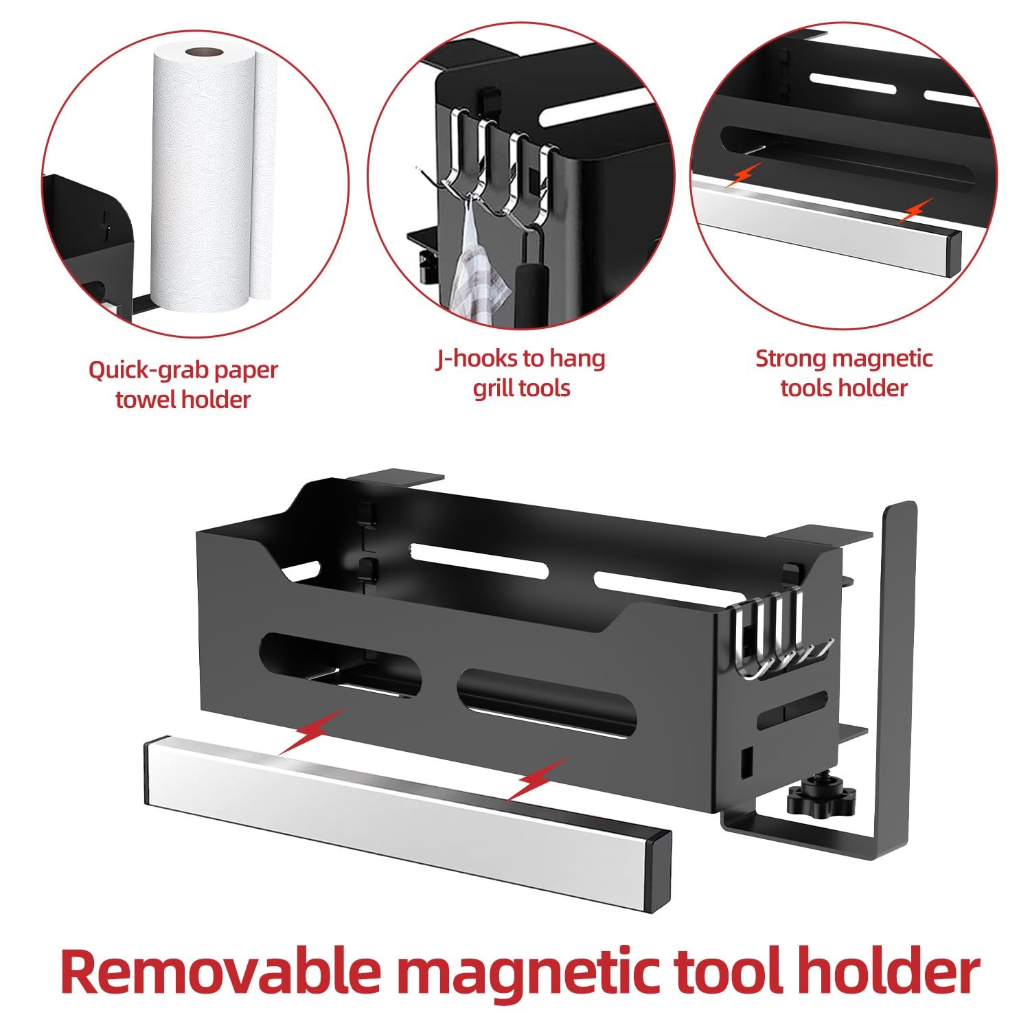 Blackstone Caddy, Grill Griddle Caddy for Blackstone 28"/36" Griddles, Space Saving Blackstone Griddle Caddy, BBQ Blackstone Accessories Caddy with Paper Towel Holder & Magnetic Tool Holder Ample and Functional Tool: Our Blackstone caddy boasts a paper towel holder, 4 J-hooks, and a magnetic tool holder, offering generous storage for all your grilling necessities. By clearing your countertop, our griddle caddy opens up more room for preparation and maintains a neat workspace, guaranteeing a seamless BBQ party. Versatile Fit with Various Countertop: Our outdoor Blackstone griddle caddy provides stability and versatility for griddles beyond 28 or 36 inches. Our Blackstone storage securely fits on side shelves, tables, or countertops, ensuring convenient access to your Blackstone accessories. Easy installation of the Blackstone tool holder ensures a swift start to your grilling enjoyment. Improved Strong Magnetic Strip: Our double-sided magnetic strip ensures a secure placement for your Blackstone griddle accessories, providing superior stability. Say farewell to accidental slips and loose items—our Blackstone accessories caddy offers a dependable hold, without the need for screws. Paper Towel Holder & 4 J-Hooks: Featuring a paper towel holder, our Blackstone grill caddy allows for easy and quick clean-up during your grilling sessions. The stable J-hooks ensure your tools stay securely in place, without any wobbling or accidental drops. This thoughtful design aims to enhance your barbecue experience with added convenience and efficiency. Package: You will receive 1 versatile Blackstone caddy, 1 paper towel holder, 1 magnetic tool strip, 4 J-hooks, and 2 clamps, all backed by our reliable 24-month warranty and our consistently friendly customer service.