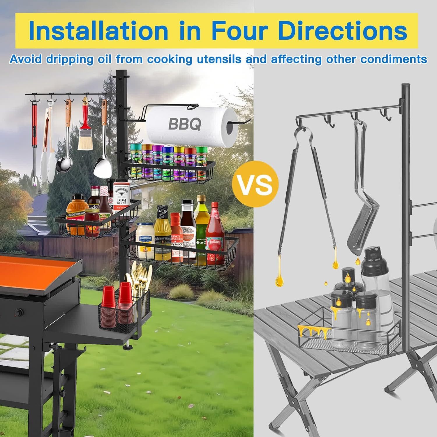Free eBay listing template designed by dewiso.com Griddle Caddy for Blackstone Griddle Accessories, BBQ Grill Caddy with Paper Towel Holder, Outdoor Kitchen Accessories for Camper, Grill Accessories Organizer, Picnic Utensil Condiment Caddy FREE AND FAST SHIPPING! About this item 【New Upgraded Blackstone Accessories】: We have upgraded the structural design of this grill accessories for outdoor grill so that it can be selected in four directions. You can choose more freely when installing parts such as paper towel holders and condiment baskets. In the desired hanging direction, you can no longer worry about oil dripping from the upper hanging accessories onto the condiment jars! 【High Quality & Large Capacity】: This blackstone griddle accessories adopts high-quality powder coating + high-quality steel material structure to ensure its durability. In addition to this, we have equipped the product with a total of three spice racks. With a 10-in-1 tool hook and paper towel holder, all barbecue supplies are organized and stored at once, so the countertop is no longer cluttered! 【Windproof Paper Towel Holder】: This is a perfect outdoor kitchen Accessories. We are well aware of the trouble of paper towels being blown away by the wind during outdoor barbecues. To solve this problem, we added a paper towel arm to the paper towel holder to prevent paper towels from scattering. Scattering will no longer happen and you can enjoy your BBQ party with confidence! 【High Compatibility & Multi-Functional Use】: We have lengthened the distance from the bottom bolt to the metal base, making it easier to install on a variety of flat desktops, including kitchen countertops, next to grills, and patio table tops. Great place to use it. The product also comes with a storage bag for you to store and carry this essential set of camper essentials. 【Grilling Gifts for Father/Husband...】This is the best camping gifts and camper must haves for anyone who loves outdoor BBQs and picnics. If your grill caddy is missing accessories or the product is damaged. Please feel free to contact us, and we will solve it for you as quickly as possible. Product We offer a 30-Day Return Policy on items which you are not completely satisfied with. You have the option for a full-refund or an exchange of the item. No returns are available on items shipped outside of the US . Shipping We offer Free Shipping to the US and ship within 2 business days of payment, usually sooner. We use UPS express shipping. That's why your products are usually delivered within 3 days . Contact We try our very best to make sure every customer is completely satisfied. If there's a problem , message us! We're happy to help. 24/7 live chat available.