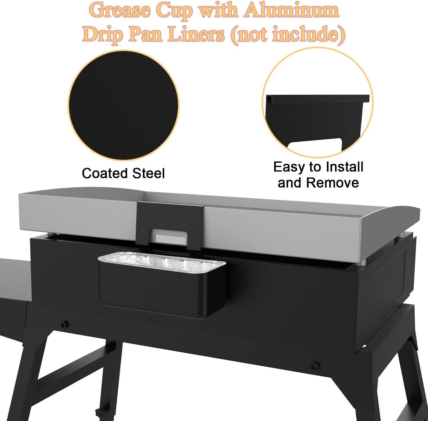 This grease catcher cup is a must-have for Blackstone griddle owners! The nonstick coating makes cleanup a breeze, and the sturdy steel construction ensures durability. It fits perfectly under my 36" griddle, keeping my cooking area clean and grease-free. Highly recommend for hassle-free griddle sessions!