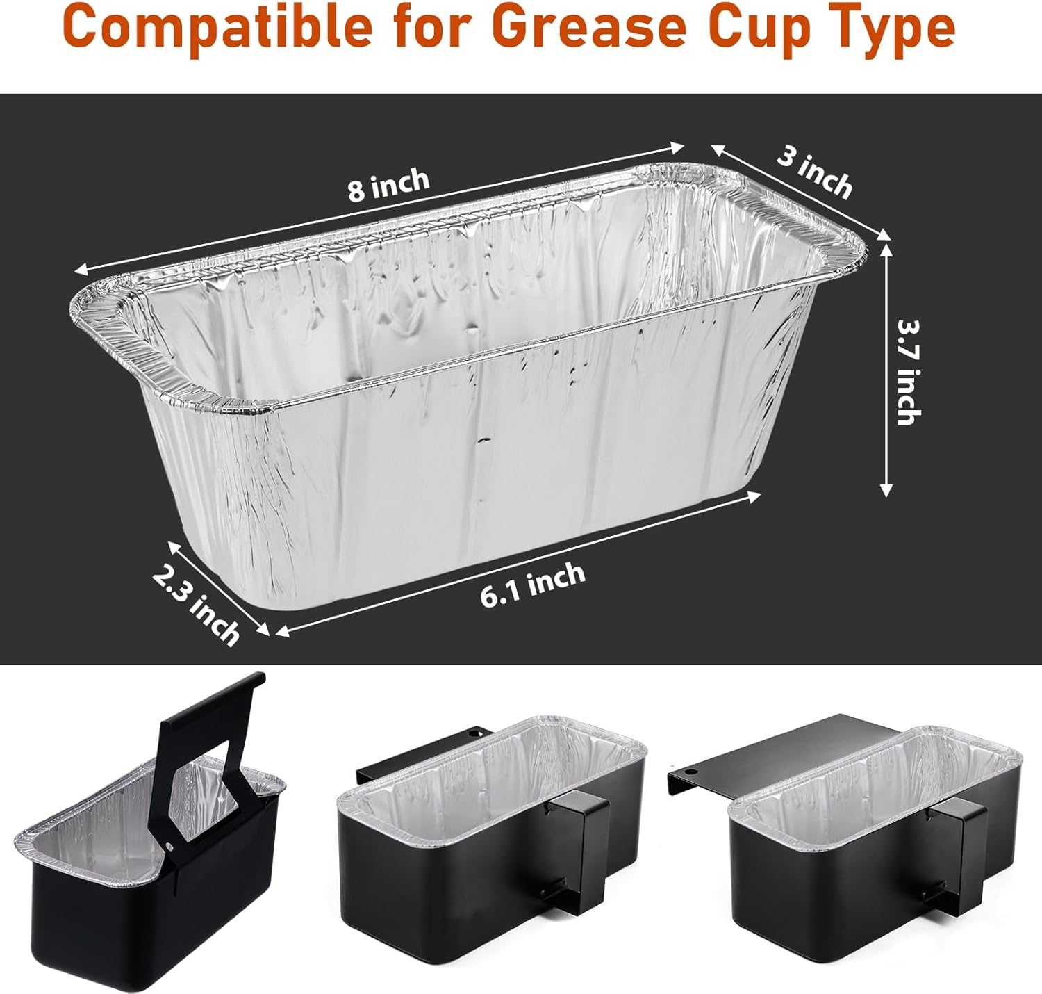 Perfect Fit : Each grease cup liner measures 8 x 3 x 3.7 inches and fit the grease tray on your Blackstone griddles 28 inch, 30 inch, and 36 inch. These Blackstone 5017 drip pan liners for the Blackstone 22 and 17 inch models will require you to bend the liners slightly to fit properly No More Messy Grill : The grill drip tray is the perfect accessory for your grease catcher. Specifically designed to collect grease and drippings from cooking delicious food on your gas grill for a clean, mess-free grilling experience Make Cleaning A Breeze : Simply fill the disposable foil drip pan liner and collect the grease and food residue, and once you're done, you can throw it away for a new drip tray, helps with easy cleanup after cooking and seasoning. Set of 30 drip pans to last all Season, price point - a fantastic value Durable And Space-saving : These drip pan liners are made of high quality aluminum foil, sturdy, heavy-duty, won't break easily, eco-friendly and 100% recyclable. The aluminum drip pans are also stackable to help you save shelf and countertop space. Lightweight and easy to carry, they are a great addition to your outdoor grill Multipurpose : Absorbs and reflects heat more efficiently, withstands extremely high temperatures without warping or melting, perfect for use in the oven or on the grill. Our grease cup liner can also be used in ovens and freezers, ideal for preparing food or preserving food before you get ready to grill. Great for baking, barbecues, grilling, beach, camping, picnics, parties and more Product Description Disposable Grease Catch Liners Replacement for blackstone Outdoor Gas Griddle. No clean up necessary Just throw away once finished, simple and efficient grill maintenance, keeping your grill clean has never been easier. Easy To Use - Simply insert it into the iron plate drip pan, fill it up and throw it in the trash. Compatibility - Perfectly compatible with Blackstone 28-inch and 36-inch skillet oil cups. Almost fits (liner needs to be slightly curved) Blackstone 22-inch grill. Heavy Duty Construction - These aluminum foil grease cup liners are strong enough to hold the weight of grease and all the mess. Save Time and Effort - Economical to pack in bulk, they are a must-have for cleaning your iron plate. Large Capacity - These foil oil cup liners hold up to 27 ounces of oil. Grill Baking Cooking Freezing EFFORTLESSLY KEEP YOUR BLACKSTONE GRIDDLE CLEAN These drip pans effectively trap grease and drippings, ensuring hassle-free griddle maintenance. Simply discard it and replace it with a fresh one to make clean up a breeze. HIGHER QUALITY MATERIAL The foil liner is made of 100% recyclable and heavy-duty aluminum foil that doesn’t leak and is food-grade., each aluminum foil tray can be reused. Add to Cart Add to Cart Customer Reviews 4.8 out of 5 stars 527 4.8 out of 5 stars 1,576 4.8 out of 5 stars 527 4.8 out of 5 stars 527 4.6 out of 5 stars 29 Price $12.99 $ 12 . 99 — $11.99 $ 11 . 99 — $16.99 $ 16 . 99 Size For 7"*3" drip pan For 7"*3" drip pan For 7"*3" drip pan For 7"*3" drip pan 9" * 6.5" Heavy-Duty ✔ ✔ ✔ ✔ ✔ 100% recyclable ✔ ✔ ✔ ✔ ✔ Material Aluminum Aluminum; Meatl Aluminum Aluminum Steel,Nylon,Pumice Stone Package 30 16 20 12 9 Pcs