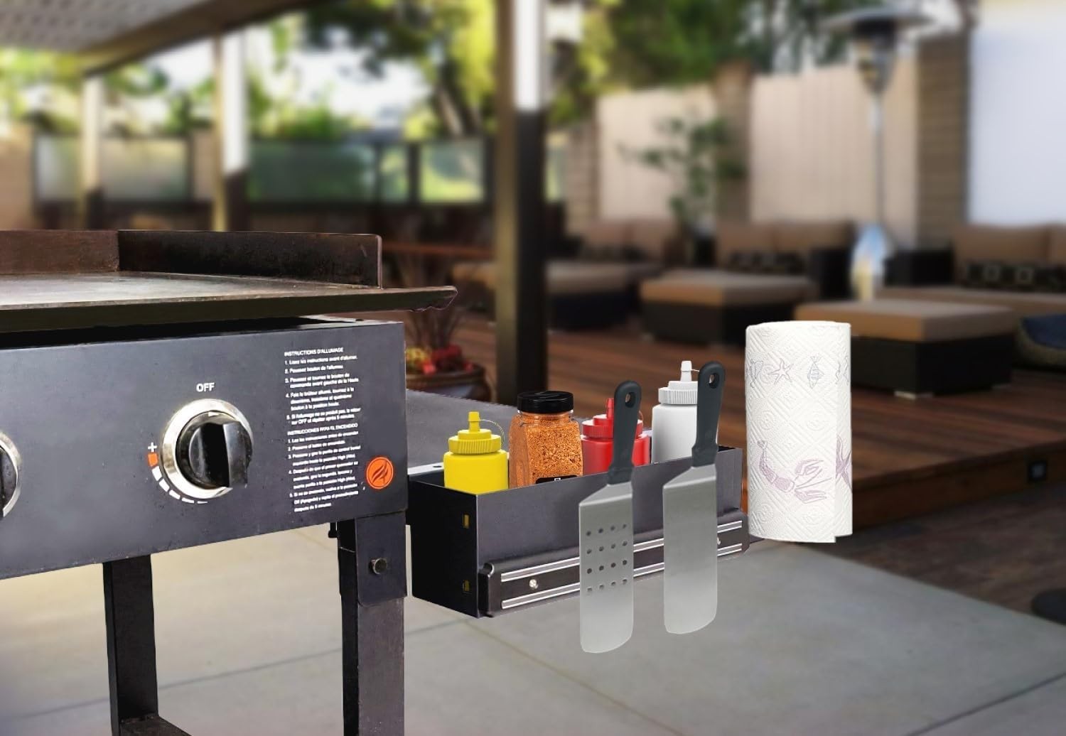 1 BBQ ๐ ๐ฎ๐๐๐ฒ๐ฟ'๐ ๐ ๐๐๐-๐๐ฎ๐๐ฒ - Enhance your cooking experience, This compact griddle caddy will keep all BBQ utensils, sauces, oil bottle, spatulas, Scraper, and others are all within your reach Fully Compatible โ The improved assembly solution allows this caddy to be compatible with multiple models of Blackstone griddle, Include 17 inch, 22inch, 28 inch, 36 inches, Pro-series, and Air-Fryer Combo, Please refer to the product description for compatible model list Perfect Match โ Made of the same materials and coating process as your Blackstone griddle, perfect match, just like the original parts Easy to Install - For all compatible models of griddles, You can install it in just a few minutes, The "z" type mounting plate can firmly fix the caddy on your griddle PLEASE NOTE - if you need this caddy to work on a 17-inch or 22-inch tabletop griddle, the heat from the combustion chamber may damage the items placed in the caddy because the installation location is close to the air outlet, such as squeeze bottle. So you may need to install wind guards for your Tabletop griddle to block the heat. no worry for other griddle models