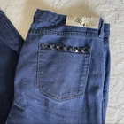 Blank NYC Size 31 Red zipper fly accent Dark grey studs on back pockets and front accents Very good used condition 98% cotton 2% spandex