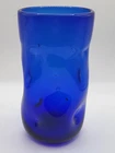 The Blenko Cobalt Blue Smooth Finish Dimple Glass Handblown Drinking Tumbler is a unique and vintage piece made in the United States during the 1990s. This 6-inch round tumbler features a smooth glossy finish and a dimple design, adding a touch of mid-century modern style to your drinkware collection. Handmade with an art glass production technique, this one-piece tumbler is perfect for all occasions and is sure to stand out with its striking cobalt blue color. Ideal for both men and women, this original Blenko tumbler is a beautiful addition to any home bar or kitchen.