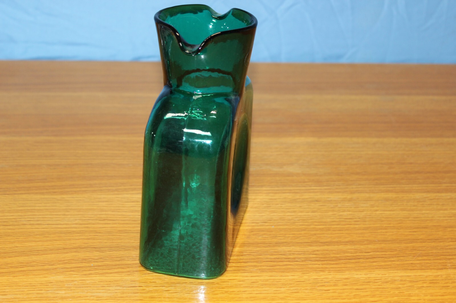 Up for Sale is a Beautiful Handcrafted BLENKO Emerald Green Glass Double Spout Carafe Water Bottle Pitcher Signed Richard Blenko and dated 2000, it also has original sticker. Approximately 8.25" tall with a 3" x 6" base. Approximate capacity of 40 oz. If you have any questions or need more pictures, please contact us BEFORE you purchase. Thank you! Please BE SURE you are buying the correct item for your needs! There are no returns for this item!