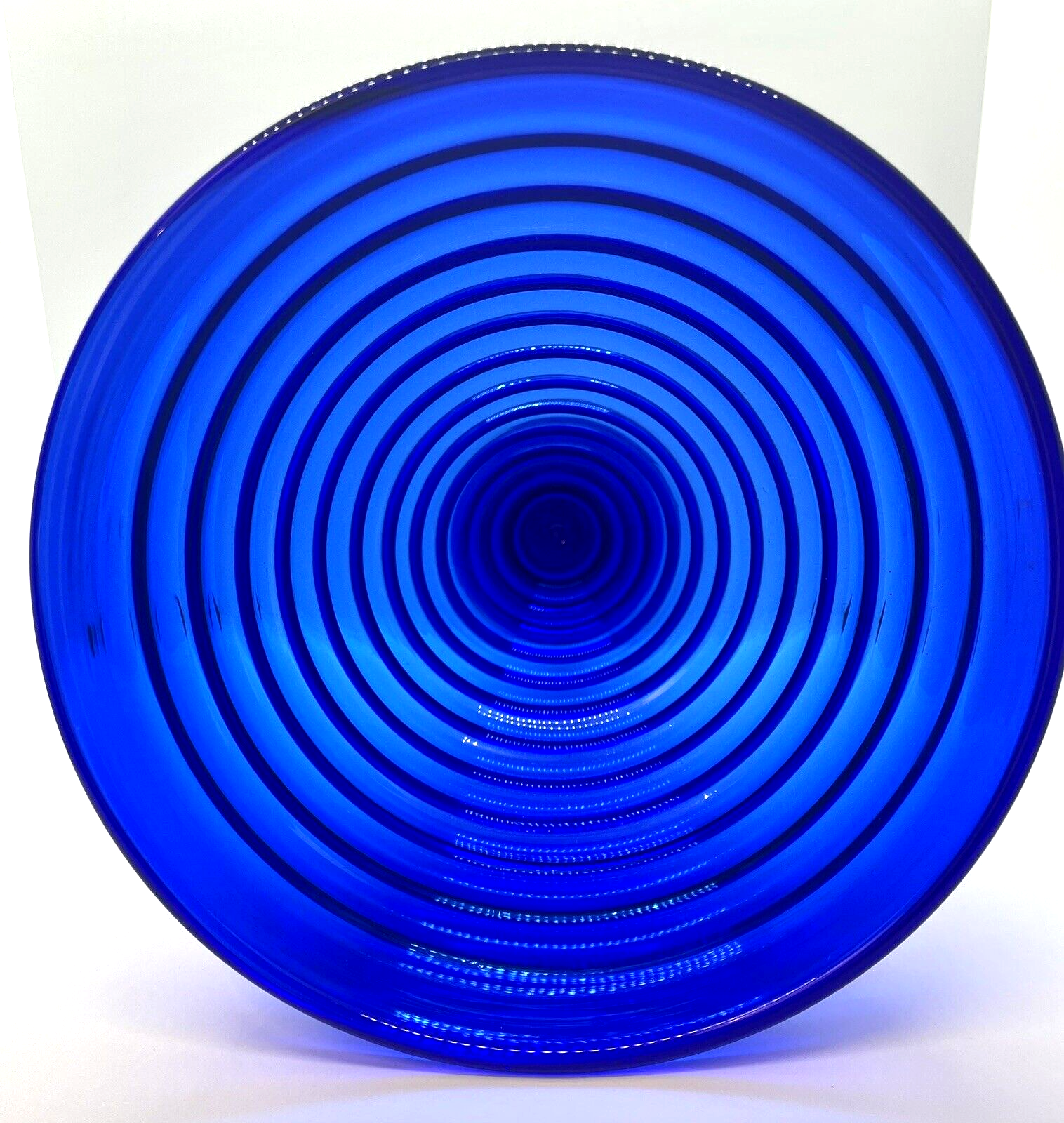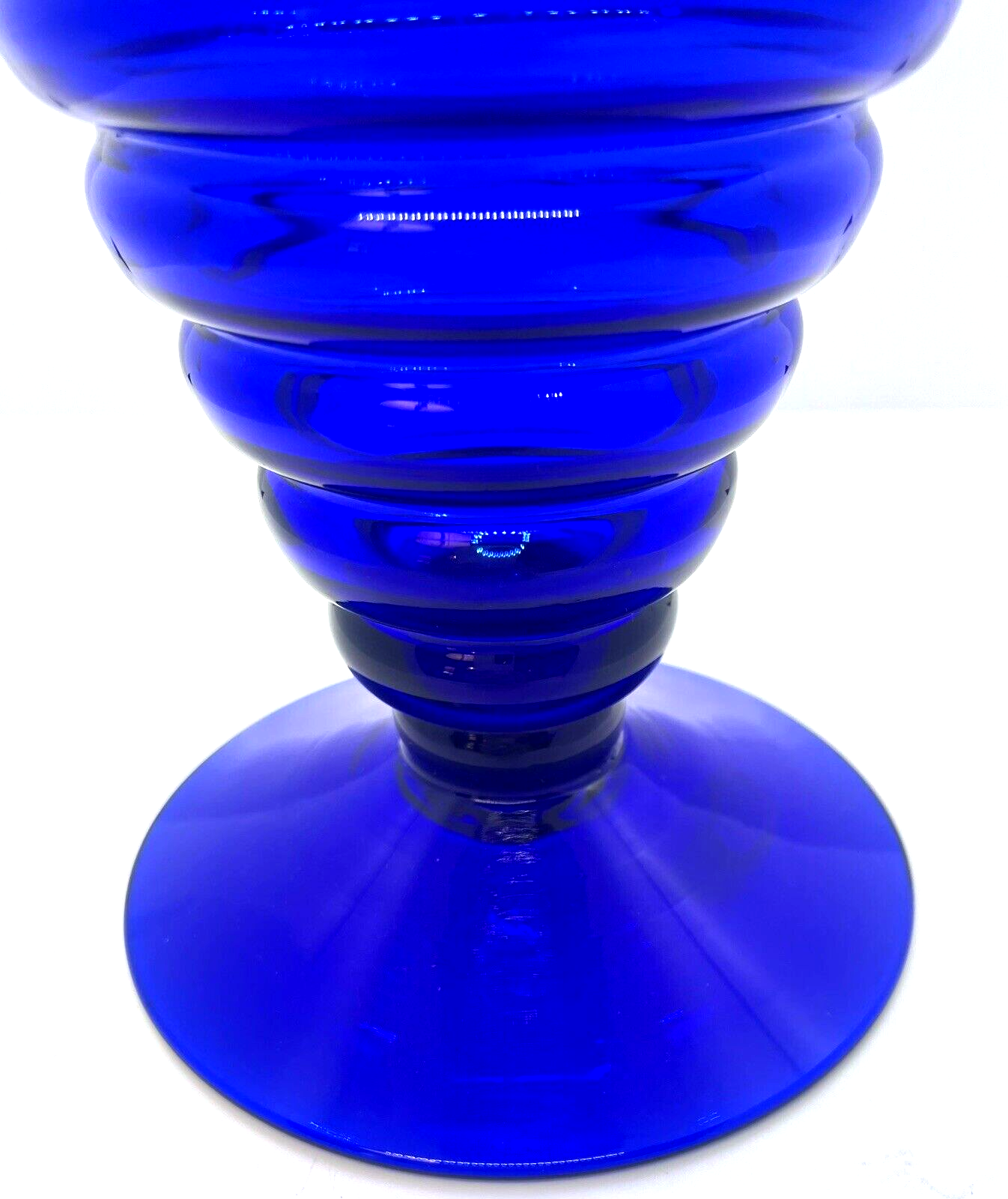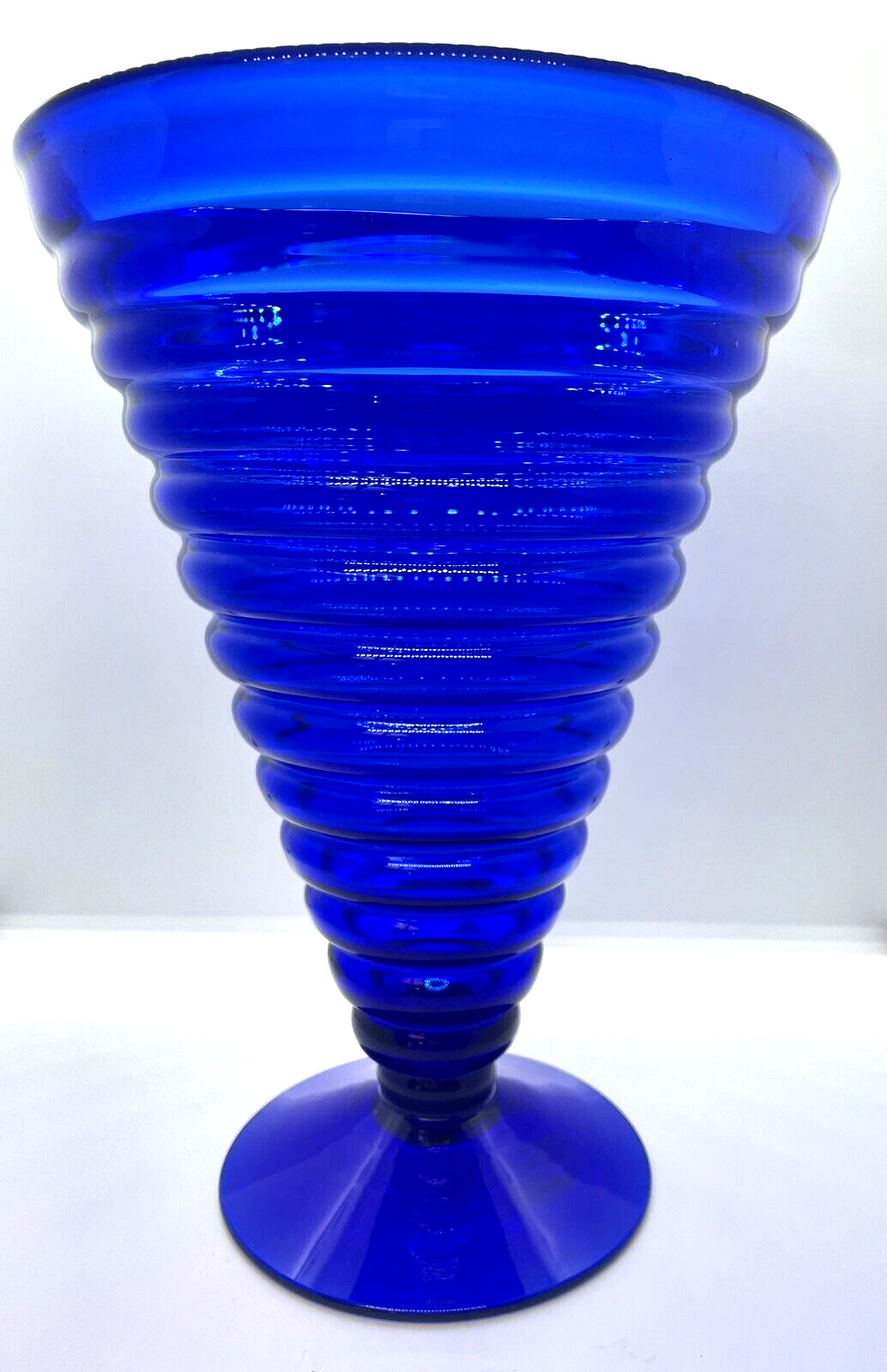 Blenko Handmade Cobalt Blue Ribbed Pedestal Vase This vase is in excellent pre owned vintage condition. There are no chips or cracks. It measures 11" tall. Please note the photos for detail.