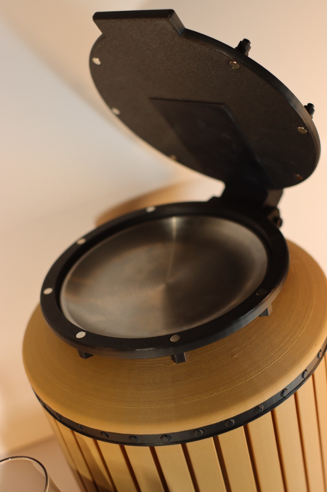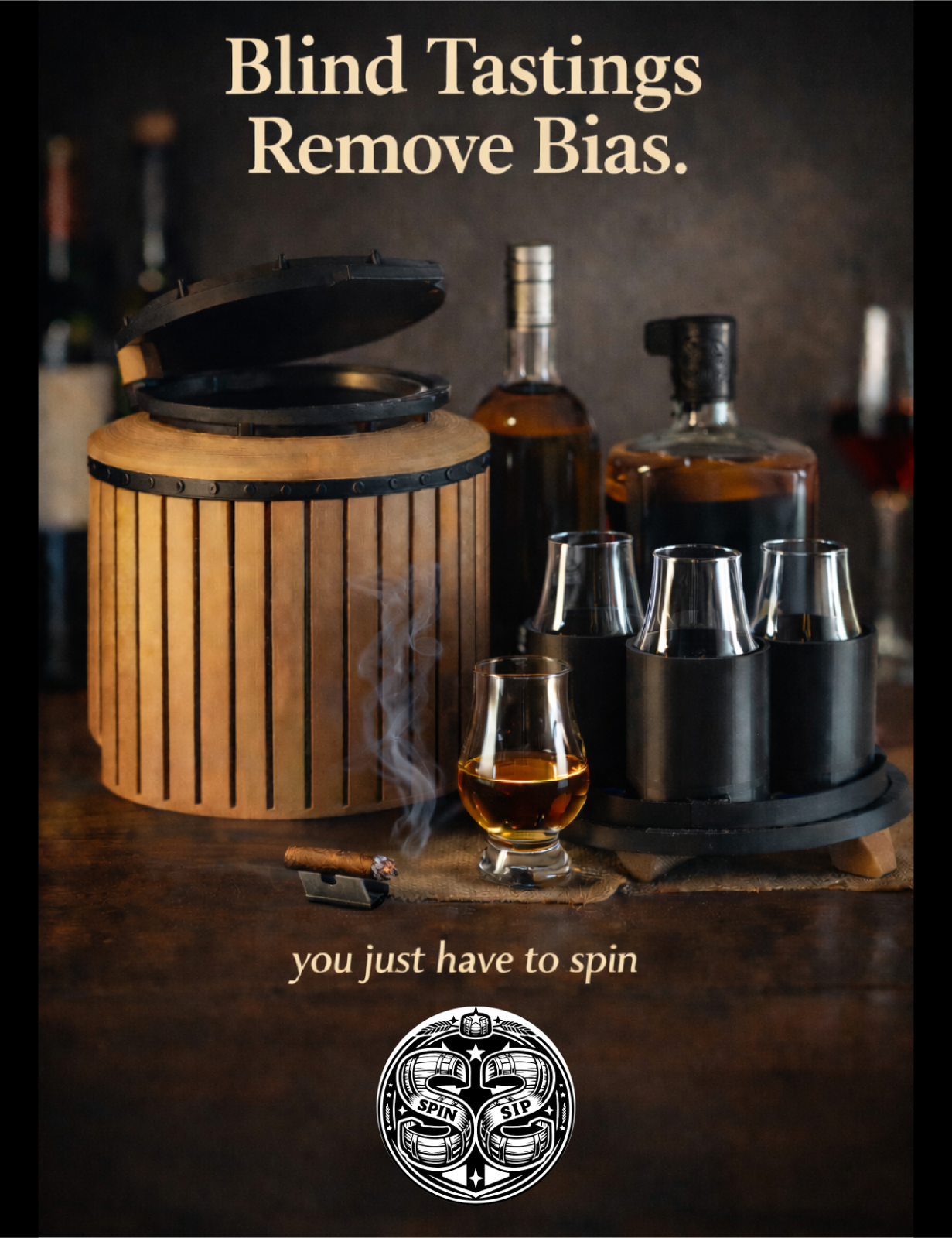 SpinSip Blind Tasting Device For bourbon, whiskey, wine, beer, and any other liquid you want to blind test What it does SpinSip removes label bias so you can focus on flavor, aroma, and mouthfeel . It is made for solo tastings or small group head to head comparisons . Spin, taste, and reveal the glass identities after the tasting is complete. Common uses include whiskey tasting , bourbon tasting , wine tasting , and beer tasting . Key features Integrated cigar ash tray Includes an operable ash tray on top for those who enjoy a cigar while drinking. The ash tray is removable for easy cleaning . Magnetic top cover The top cover uses magnets for easy assembly and quick removal . Not intended for transportation. 3D printed build Made using 3D printing technology with PLA filament in matte black and wood style finishes. Light layer lines and seam marks may be visible and are normal for 3D printed parts. What is included One SpinSip blind tasting device Four tasting glasses Four metal blanks attached to the glasses for writing notes or numbers Bottles shown in photos are for display only and are not included. No alcohol included. Limited run 10 units per month SpinSip is built for taste, conversation, and discovery. Use it with friends, compare pours fairly, and enjoy the moment. All sales final. No returns or refunds.