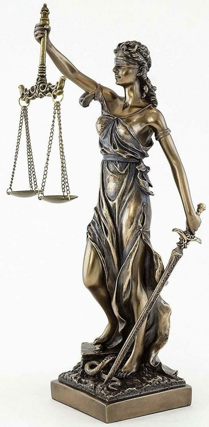 Roman goddess of Justice Carrying the scales of justice in one hand and a in the other and with her eyes blindfolded Symbolizes the fair and equal administration of the law without corruption, avarice, prejudice, or favor Measures approx. 13" tall. Cold Cast Bronze Justitia was the Roman goddess of Justice and is portrayed as carrying the scales of justice in one hand and a in the other and with her eyes blindfolded which symbolizes the fair and equal administration of the law without corruption, avarice, prejudice, or favor in the legal systems. This statue is beautifully designed, sculpted and handcrafted to the finest detail in Cold Cast Bronze. "Cold-Casting" is a term used to describe the process of mixing metal powder with a resin to create castings that give the appearance of solid metal, without the high cost of using actual metal. Measures approx. 13" tall.