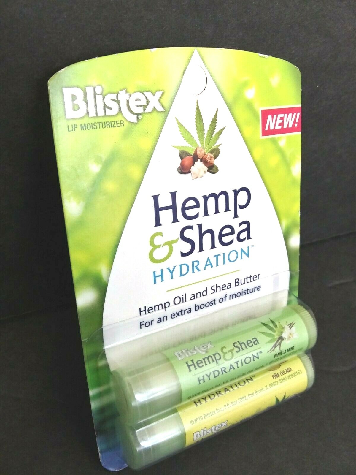 Blistex Adult Lip Balm Hemp And Shea Hydration Vanilla Mint And Pina Colada NEW The Blistex Adult Lip Balm in Hemp and Shea Hydration combines nourishing ingredients like Shea Butter and Jojoba Esters to provide deep hydration for dry, chapped lips. The lip balm comes in a delightful vanilla mint and pina colada flavor, making it a treat for your lips. With a PAO of 12 months, this product is perfect for all skin types and is proudly made in the United States by the trusted brand Blistex.