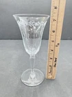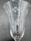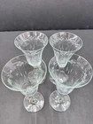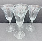 Set of four vintage clear glass water goblets featuring etched patterns of berries and leaves. Each goblet has a capacity of 6 ounces, a diameter of 3 3/8 inches, and a height of 7 1/8 inches. The goblets have an Art Nouveau style and are unmarked. They are recommended for hand wash only and are suitable for all occasions. Made of glass using blown glass production technique with cut glass details.