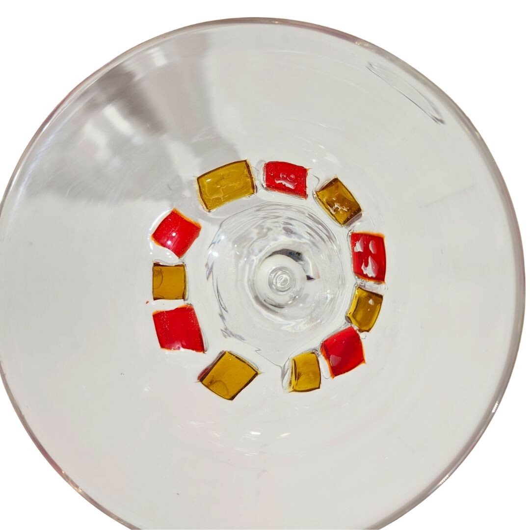 Blown Martini Glass Clear Stemmed 6.5" Wide Rim Applied Yellow Red Lot of 2 No chips or cracks, but glasses have been used and may present minor scratches and signs of wear. Applied red and yellow squares are done by hand and are not perfectly uniform. Please thoroughly review photos for quality and condition of item. If you have any questions, feel free to reach out.