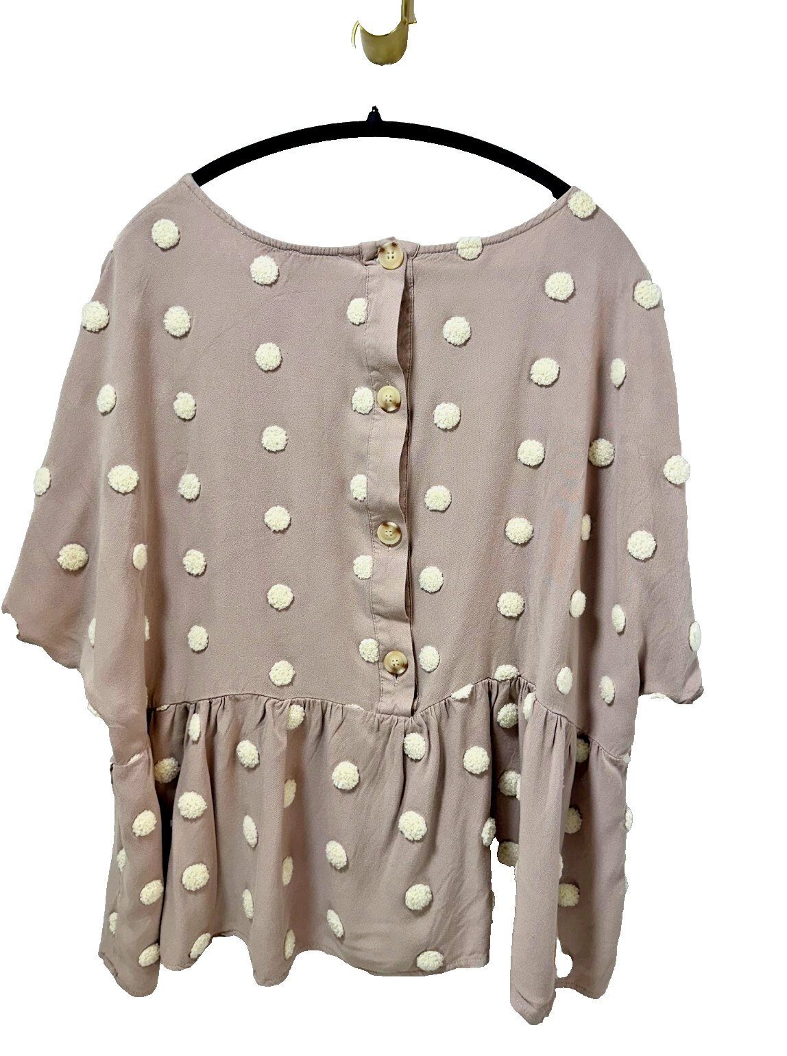 The Perch by Blu Pepper Women's 3XL Dusty Rose Textured Swiss Dot Peplum Top is a stylish blouse designed for plus-sized women. Featuring a regular fit and short sleeves, this top showcases a ruffle accent and a round neckline. The polka dot pattern and peplum style add a playful touch to the overall look, making it a versatile piece that can be dressed up or down for any occasion. Made in a beautiful dusty rose color, this top is perfect for women who want a fashionable and comfortable addition to their wardrobe.