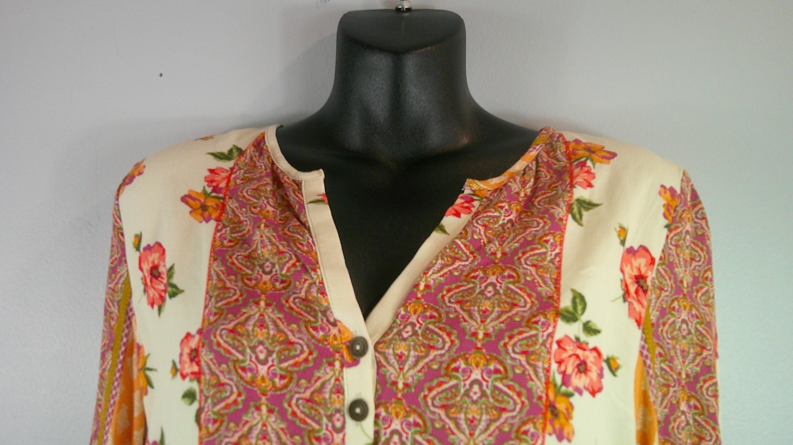 $ 32.74100% Silk Navy Brown Print Tunic Top Size S Flowy Layering Shirt Euc