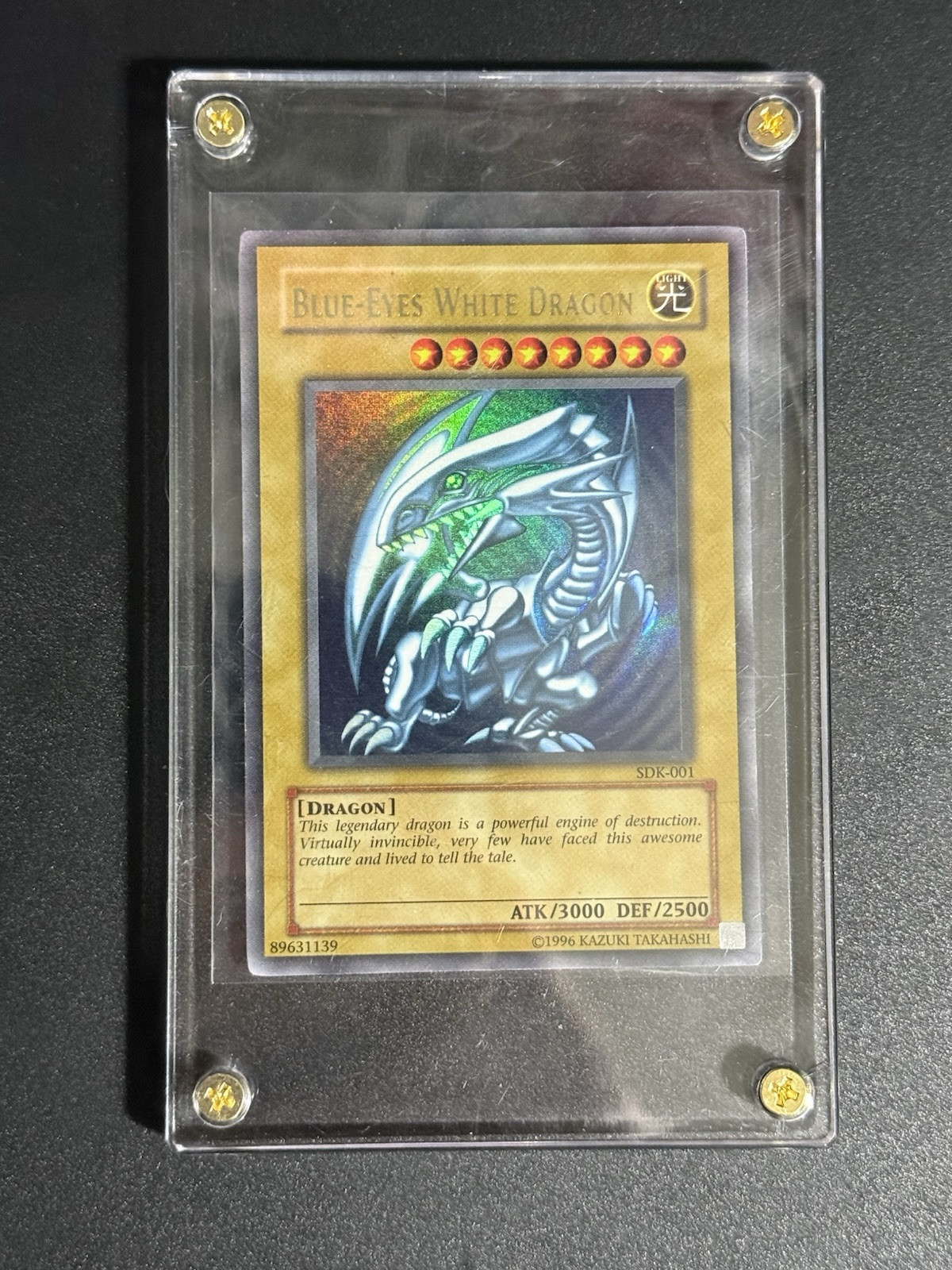 The product is a Blue Eyes White Dragon card from the Yu-Gi-Oh! Trading Card Game. It is an Ultra Rare, Unlimited edition card with a Holo finish. The card features the creature type Dragon and is manufactured by Konami. It is a Normal card made of Card Stock material. The card is not autographed and not graded. It has a unique serial number SDK Dash 001, but the ink on the card appears faded. This card is faded. You can tell how yellow it is not looking for any DM’s talking to me about what it’s worth.