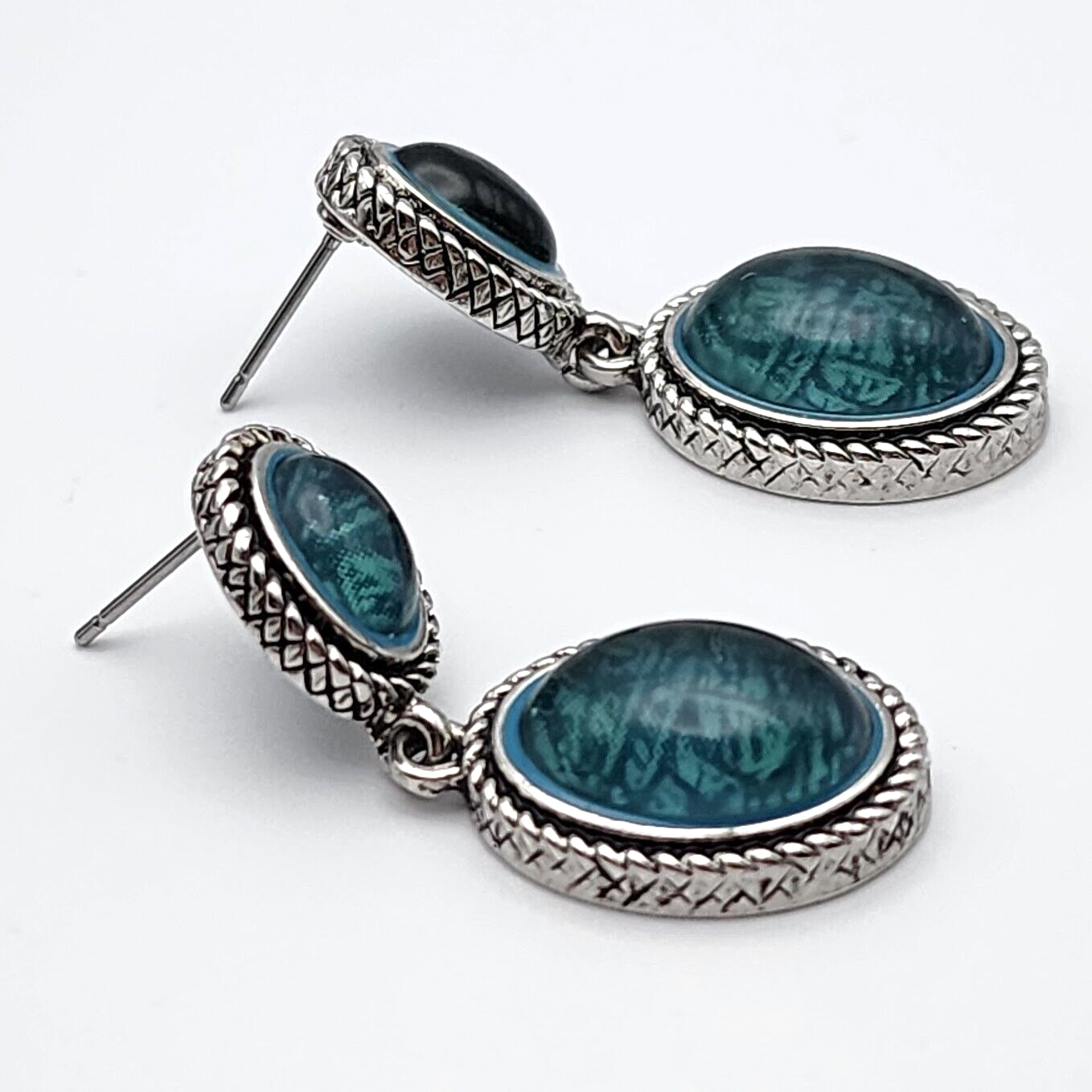 Blue Green Cabochon Silver Drop Dangle Butterfly Wing Earrings