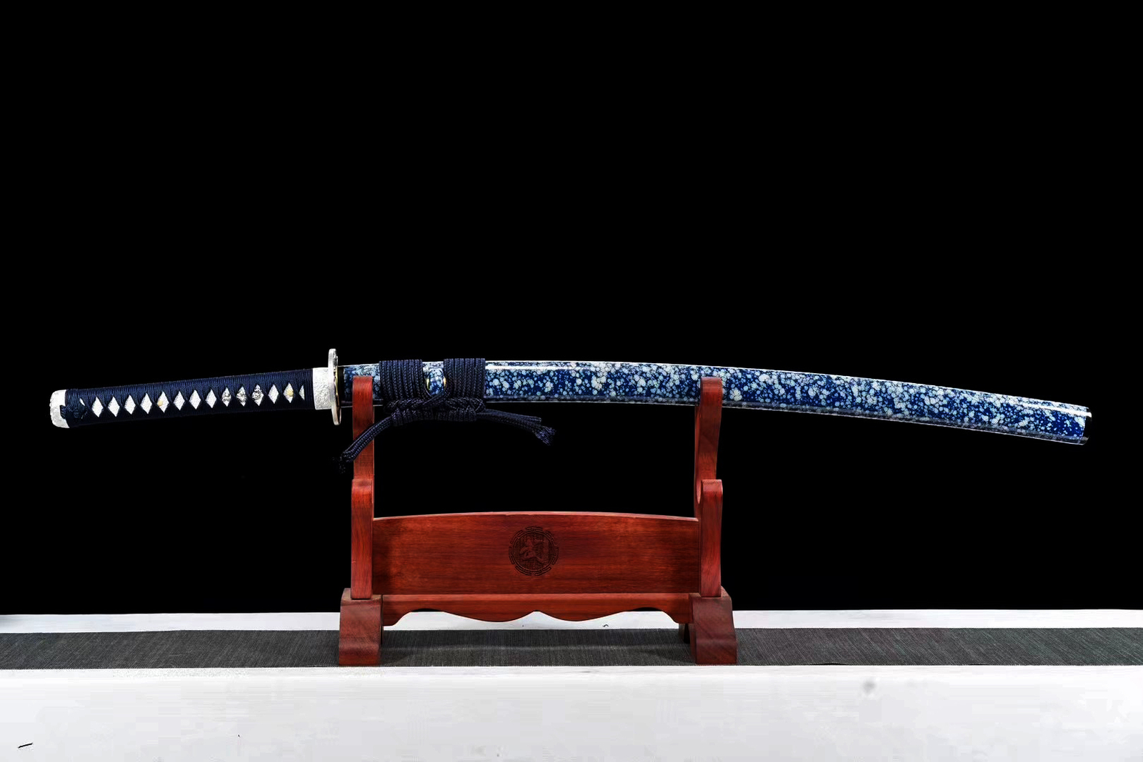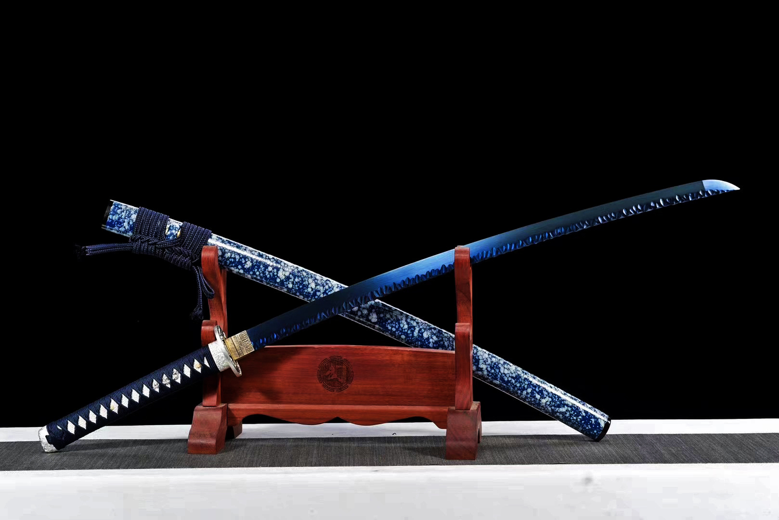 Product Parameter: Name: 白虎王 Material: T10 high carbon steel+Electroplate color Overall: 103cm/40.6" Blade: 70cm/27.5'' Handle: 26cm/10.24'' Widdth: 3.2cm/1.26'' Thickness: 0.7cm/0.28'' HRC(Hardness): 56 Bo-hi: No blood groove Hamon: No hamon Seppa&Habaki: Brass Fittings: Alloy+dark blue Japanese synthetic silk rope Construction: Maru Saya: Lacquered wood scarbbard Tang(nakago): Full tang (2 bamboo mekugi vertically fixed handle, very firm) Craft: Hand forged and polished with 12 procedures.quenching,electroplating blue,unique Hammering pattern, etc. The steel we use is not the normal steel with the truck or cars or other life electrics, the steel use for the blade contents much more carbon and the purity can not be comparable. * It's a functinonal sword. After test, it can cut bamboo, A4 paper and water bottles,etc . * All the fittings can be replacement. Tsuba & Fuchi & Kashira & Habaki Saya Additional Service About us Delivery details Tsuba & Fuchi & Kashira & Habaki Alloy Tsuba Iron Tsuba ( extra $10) Brass Set ( extral $50 ) Alloy Fuchi & Kashira Habaki TSUKA-ITO & SAGEO Tsuka-ito is the wrapping of the tsuka and sageo (下緒 or 下げ緒) is a hanging cord that is passed through the hole in the kurigata (栗形) of a Japanese sword's saya. SAMEGAWA Samegawa(鮫皮)is the ray or shark skin wrapping of the tsuka (handle/hilt). Saya Please contact us before placing an order to see if there is any stock available, as well as any additional charges. OX Horn Saya Additional Service It's free for engraving English words, Chinese Characters and Japanese Kanji , etc. You need pay extral $20-30 for engraving patterns. Hamon We can add or remove the machine-made wavy hamon for free. Bo-hi ( Blood Groove) Usually thought be used for bloodletting only. It is also used to lighten the weight of the sword. We can add or remove Bo-hi for free Sharpness Most of our blades are sharp. We can also make the blade unsharpened for free if you require. Colored Blade If you want to change to a different color blade, please contact us before purchase. Matching Swords Set If you buy one katana, we can make a matching Wakizashi or Tanto for you. The price varies from different swords. Please contact us if you need make custom matching set. About us We have our own sword-casting factory. The factory is located in Longquan, a small town with a long history of sword-casting in China. Most of the famous Swords in China are made there. Rich raw materials, skilled technology, traditional sword casting technology from generation to generation. Manual production really takes a lot of time. We will prepare most products in advance ,and arrange delivery within about a week. However, sometimes the delivery time is delayed due to weather or raw materials,etc. we hope to get your understanding. Feel free to contact us to inquire about the status of your order. Each handmade sword is unique. Our swords are great for gifts or for your own collection. Our swordsmithing master makes every sword attentively, hope you can feel our sincerity. We will also give you the best customer service, any questions please feel free to contact us. Delivery details a) Import duties, taxes and charges are not included in the item price or shipping charges . These charges are the buyer’s responsibility. b) If you do not receive the package, or the package is damaged during transportation. We'll take care of it. Please feel free to buy. c) If it is mentioned in the product description that the package includes the sword bag or sword holder , the style will be random. The sword holder or sword bag on the ebay picture is the props we use for shooting. If you really like a style, please contact us before buying. d) If you have any problem after recieve the package (wrong size, wrong style, etc.). We always provide you with the best after-sales service. Please give us a chance to help you before you give us a bad feedback . Thank you very much!