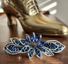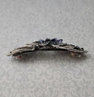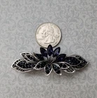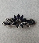 Magnetic collar brooch. Dark blue sapphire crystal set in dark silver alloy and accented with dark blue crystal rhinestones. Lovely collar brooch for horse show attire, Hunt Seat, Dressage, Driving. Brooch is slightly curved to fit the neck and sets snug with the collar, Ratcatcher, cravat, stock tie. No pinning! No poking! Easy to attach and position! Magnets are adhered on each end of the brooch. This looks gorgeous on hats and scarves too! Why choose magnetic brooches over traditional pins? Because they are strong and much easier to use. No more struggling to attach pins, poking yourself and repeating the process because you didn’t get it placed correctly the first time. With magnetic brooches you just slide the brooch into the desired place – Wallah! No damage to your cherished attire. Magnets are very strong and will securely hold to your attire. One magnet is adhered to the jewel and another is supplied to hold in place. Place fabric between the jeweled magnet and the back magnet. Quality materials used, no acrylic or plastic. Items are made of metal alloys, faceted crystals and glass. Choking hazard, and can be dangerous if swallowed. Please keep out of reach of children and do not place in the mouth. Please see instructions sent with item for full product care.