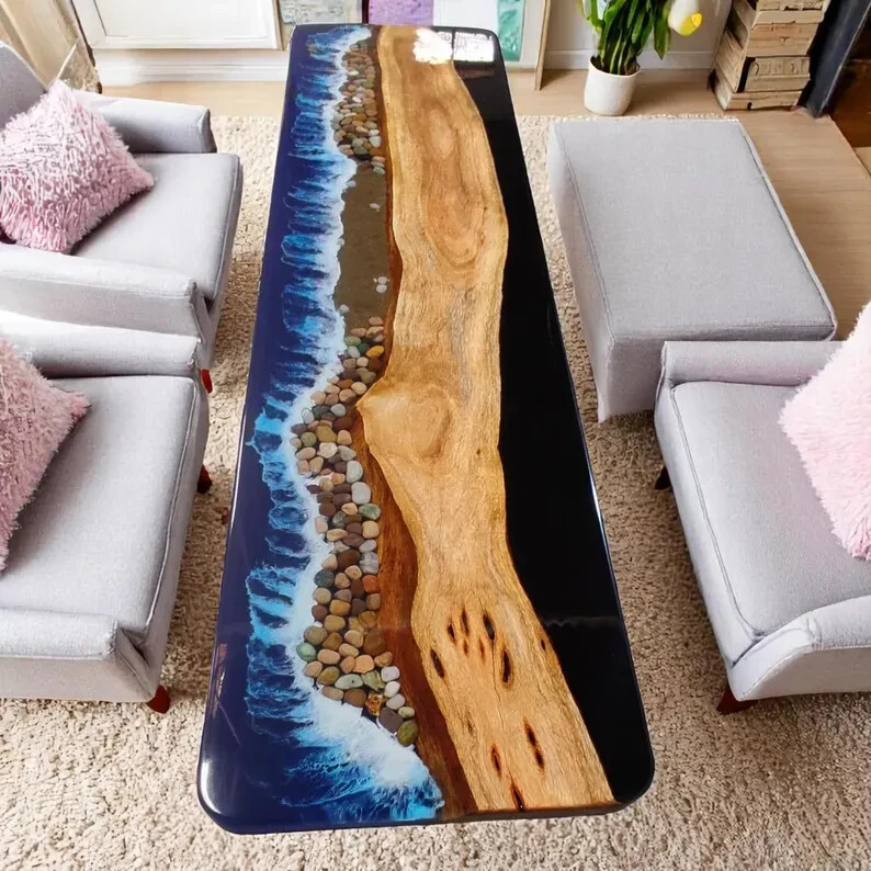 love the table, a true work of art. Price to quality relationship very high. There are a lot of wanna bes out there, but few true craftsmen in this space, and they are craftsmen. Lots of back and forth to get what we desired.. nonlinear edges, curvy river, branch circles within wood, blue resin covering only 20% of table overall, specific length and width, leg style. Shipped via air very quickly too. Two thumbs up!