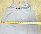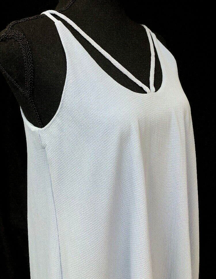 Size XS Periwinkle color, true color in second and third picture, hard to capture true color on camera Loose dress- flares from bust with no stretch Strap detail on front and back neckline Hem detail- front is a bit shorter than back Material: 100% polyester, Lining: 100% rayon Measurements: 32-33" length front to back, 17"bust flat (34") Flared and looser at waist and hips Condition: Preowned Good condition Second & third picture closest to true color, true periwinkle See photos for details and correct measurements Please contact us with any questions or concerns. Thanks!