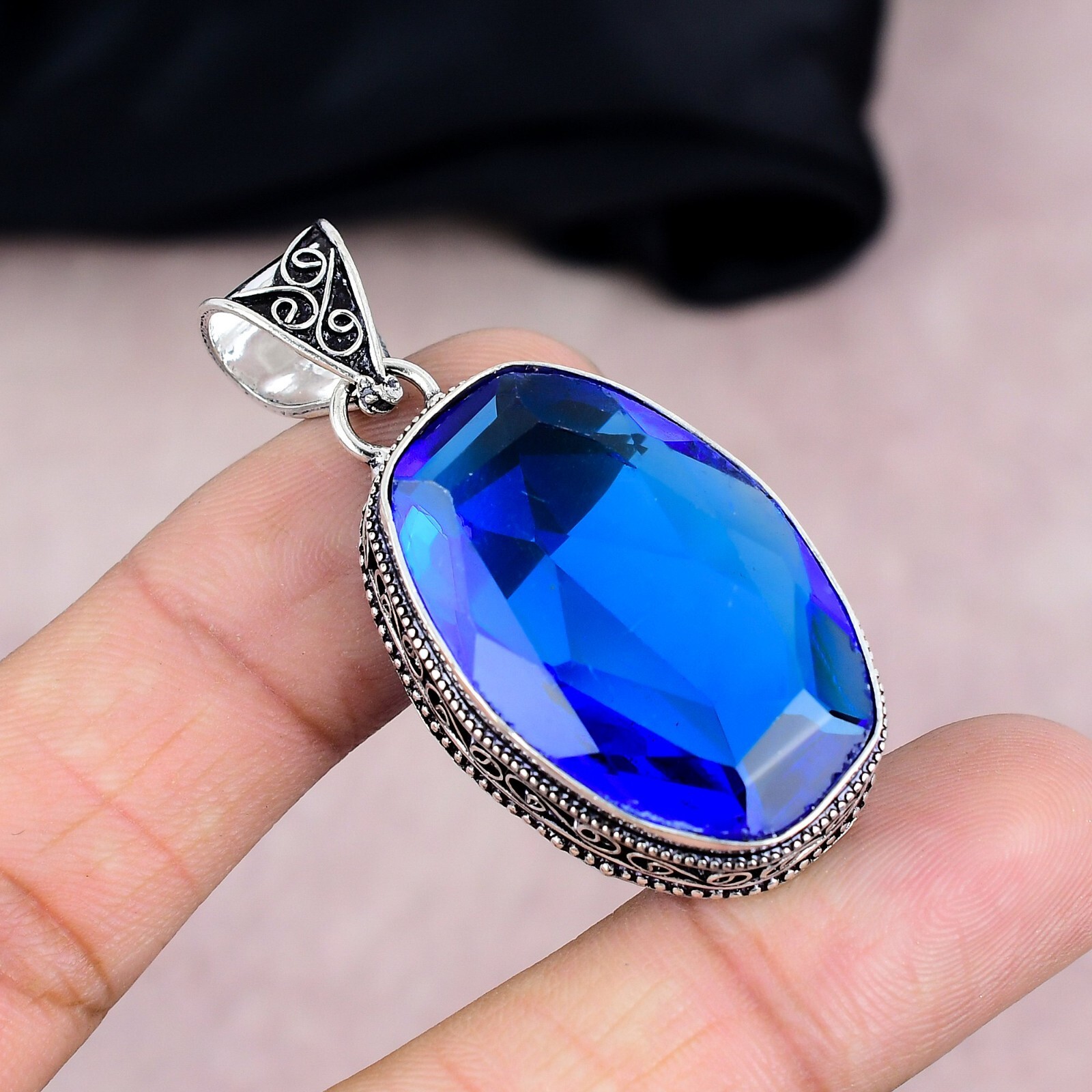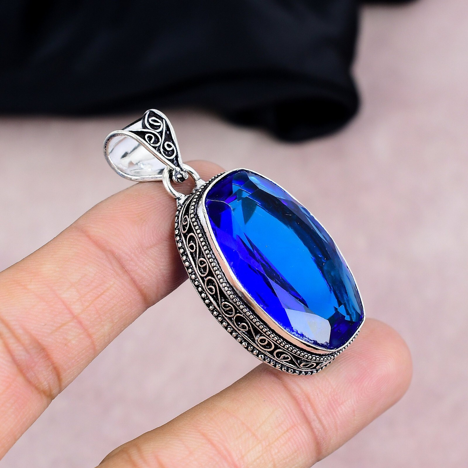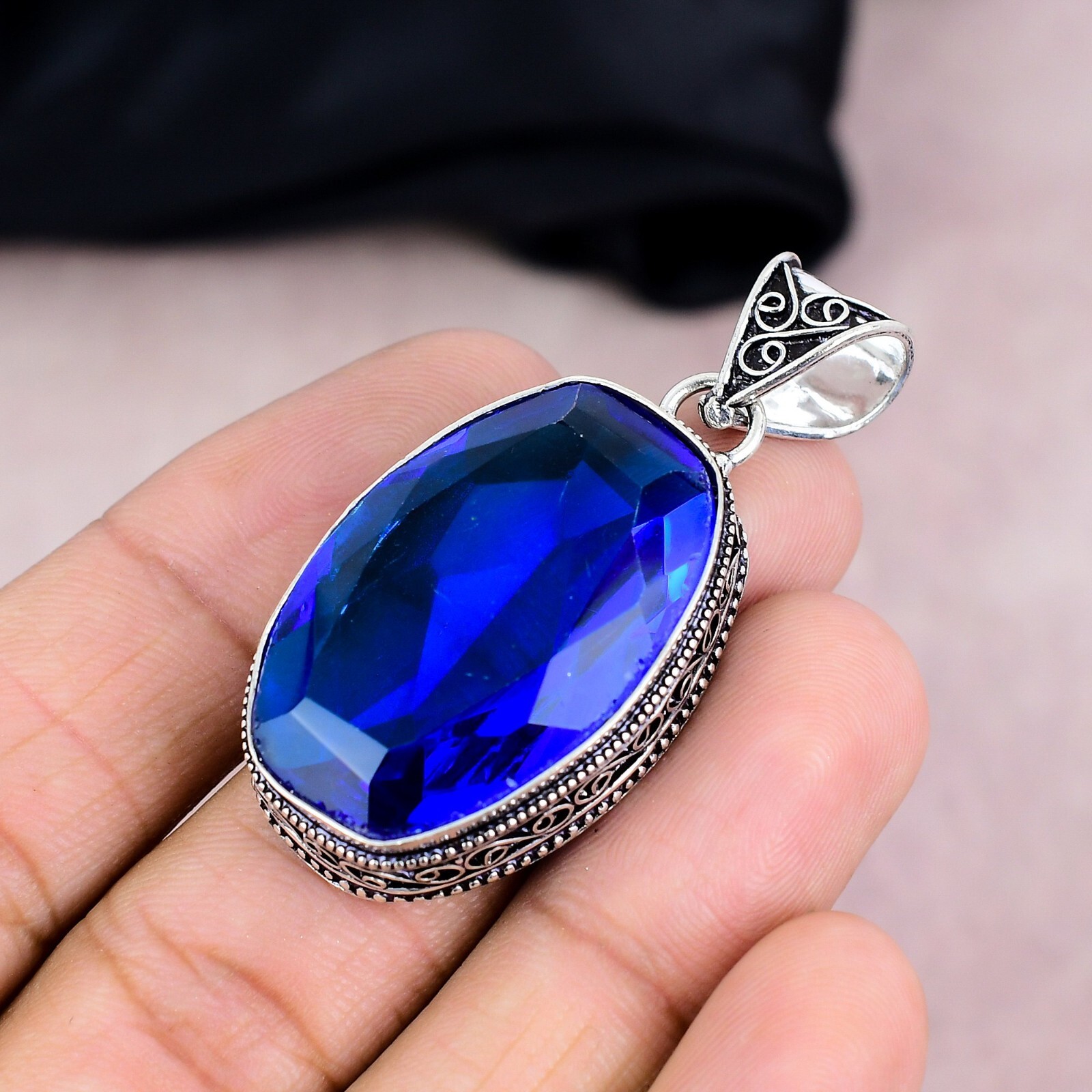 Colored Diamond Intensity:N/AChain Type:N/APendant Shape:Same As PictureType:PendantBrand:HandmadeMain Stone:Blue SapphirePendant/Locket Type:Same As PictureBase Metal:Sterling SilverFeatures:HandmadeSetting Style:BezelMain Stone Creation:Lab-CreatedClosure:Same As PictureCountry of Origin:IndiaMetal Purity:925Theme:Beauty, Bohemian, Ethnic, Halloween, Love, NatureSecondary Stone:N/ANumber of Diamonds:N/ANecklace Length:5.5"Number of Gemstones:1Style:PendantMain Stone Color:BlueOccasion:Anniversary, Birthday, Christening, Christmas, Engagement, Father's Day, Graduation, Mother's Day, Valentine's Day, WeddingCollection:HandmadeCountry/Region of Manufacture:IndiaMaterial:GemstoneDiamond Color Grade:N/ATotal Carat Weight:10 carat and aboveDiamond Clarity Grade:N/ACertification:N/AColor:SilverMetal:Sterling SilverMain Stone Shape:OvalCut Grade:N/AMain Stone Treatment:Not Enhanced