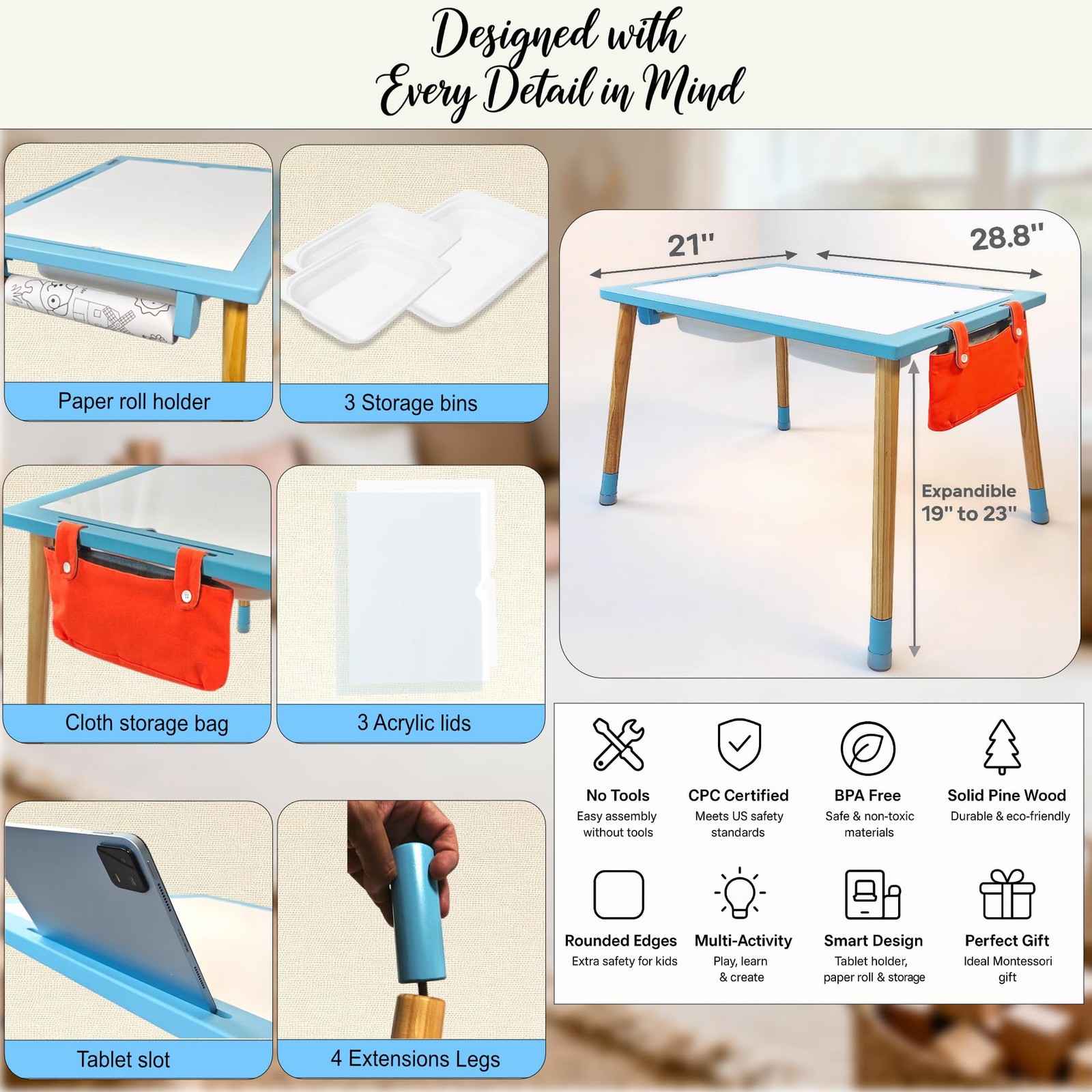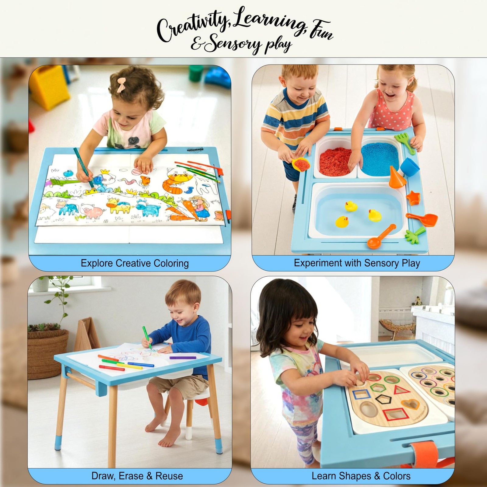 Discover the ultimate Montessori activity table: the Blue Sensory Table for Toddlers. More than just a play table, it’s a complete learning and discovery station designed to grow with your . This versatile ’ sensory table features 3 play bins, 2 opal acrylic lids, 1 transparent lid, paper roll holder, wooden inserts, fabric storage bag, coloring roll, leg extenders, color paddles, markers, and more. ✨ Why it’s unique? 3 Adjustable Heights: 5.5" for floor or bedside play, 19" standard table height, and 23" extended for taller . Light Table & Tracing Station: Use the opal lids with LED lights (not included) to create a glowing sensory table, or reuse worksheets with the transparent lid. Easel Position: The included wooden support tilts the lid, turning the table into a drawing easel. Multi-Purpose Design: From sensory setups (water, sand, rice, slime) to studying, reading, building blocks, and snacks, this table is truly multifunctional. Educational & Fun: Perfect for Montessori-inspired learning, fine motor skills, creativity, and open-ended play. Safe & Eco-Friendly: Made from pine wood with CPC certification, safe finishes, and durable materials. Setup is fast and tool-free. With its vibrant blue frame, rounded edges, and countless activity options, this sensory table is the perfect blend of fun, learning, and style. Give your more than just a toy — give them a complete play & learning station that inspires imagination every single day. Montesory Table, sensory table for toddlers, sensory bin table, activity table, sensory table, water table for toddlers, sand table , sensory table with paper roll, table and chairs, chairs for table, activity bins, sensory table with bins, table with storage, sensory table for toddlers age, activity table for toddlers, activity table for toddlers, sensory table for , play toys outdoor, Mesa sensorial para niños 🎨 The Most Complete Sensory Table Includes 3 sensory bins in 2 sizes, 2 opal white acrylic lids, 1 transparent acrylic lid, paper roll holder, adhesive coloring roll, fabric storage bag, 2 wooden sensory inserts, 6 color paddles, 8 markers, leg extenders, and floor protectors. A multifunctional Montessori activity table with everything your needs for endless play. 📏 Adjustable to 3 Heights: Floor, Play, and Desk The blue sensory play table measures 28.8" x 21". Use the leg extensions in three ways: directly on the base (5.5") to create a floor table or bed table, at standard height (18"), or extended (22"). This unique system makes the sensory table grow with your and adapt to every activity. 🧩 Open-Ended Sensory Play Perfect for sand, water, slime, rice, or any sensory setup. From pouring and mixing to sorting and stacking, this sensory table encourages fine motor development, STEM skills, and Montessori-inspired play 💡 Multi-Purpose: Light Table, Tracing Station & Easel With 2 opal acrylic lids, turn it into a light table (LED system not included). The transparent lid allows to reuse worksheets endlessly, while the wooden support lets tilt a lid and transform it into a drawing easel. Creativity has no limits! 📚 Learning, Building & Everyday Use More than a play station: it’s also a study desk, reading corner, snack table, or building surface for construction toys. The integrated /holder lets drawing tutorials, watch educational , or copy shapes easily. 🌍 Safe & Sustainable Materials Crafted from eco-friendly pine wood, lightweight yet sturdy, with rounded edges and non-finishes. CPC certified (Children’s Product Certificate) to safe play for toddlers and preschoolers 🛠 Quick Assembly & Perfect Gift Tool-free assembly in minutes: just attach the legs and start playing. Designed to inspire creativity and learning for toddlers, preschoolers, and kindergarteners. A unique and educational gift for birthdays, Christmas, or any special occasion.