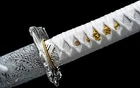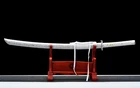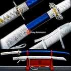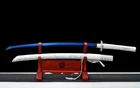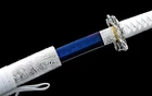 Elegant White Katana Blue T10 Carbon Steel Battle Ready Japanese Samurai Sword Product Parameter: Number: TYQ416 Swordsmith: 劉旭 Package: 1sword+ 1bag Sword style: Japanese samurai katana sword Material: 1095 high carbon steel Overall length: 103cm / 40.6" Handle: 26 cm / 10.24'' Blade: 70cm / 27.5'' Width: 3.2 cm / 1.26'' Thickness: 0.7cm / 0.28'' Hardness(HRC): 56 Blood groove: No bo-hi Nakago(tang): Full tang , the handle and blade is fixed with two bamboo mekugis Sharpness: battle ready and sharpened, can cut bamboo, branches, water bottles and slice paper. Blade Color: Blue Blade Seppa &Habaki: Brass Saya: Hardwood covered with PU leather Fittings: Alloy Craft: Traditional hand forged and polished, electroplating color. After the tests, the sword can be used to cut bamboo, paper, water bottles, tatami, etc. Note About us Sword Noun Explananation Delivery details Sword maintenance Note 1) We have already sent this item to the warehouse in America in advance. It's the lowest price we've ever had, and it's the lowest price on eBay . American customers can receive the packages 1-7 days after placing an order. 2) Because the item is already in the warehouse in the United States, we are sorry that we cannot add free carving service & replacement parts service for the moment. 3) We have free return service. If you don't like anything after you receive the package, we will bear the loss of return. Please feel free to buy. About us We have our own sword-casting factory. The factory is located in Longquan, a small town with a long history of sword-casting in China. Most of the famous Swords in China are made there. Rich raw materials, skilled technology, traditional sword casting technology from generation to generation. Manual production really takes a lot of time. We will prepare most products in advance,and arrange delivery within about a week. However, sometimes the delivery time is delayed due to weather or raw materials,etc. we hope to get your understanding. Feel free to contact us to inquire about the status of your order. Each handmade sword is unique. Our swords are great for gifts or for your own collection. Our swordsmithing master makes every sword attentively, hope you can feel our sincerity. We will also give you the best customer service, any questions please feel free to contact us. Sword Noun Explananation Quenching After the blade has been shaped, the sword would be quenched. We quench our swords in either water or oil. Water quenching produces a tougher edge which can also be hardened further more using clay. Blades quenched in oil are still considerably hardened and do have superior flexibility compared to a water quenched blade. Folded Steel: In the forging process , the most useful process is the folding, where the metals are forge welded, folded, and welded again, as many as 124 times(15 times is the best). The folding removes impurities and helps even out the carbon content, while the alternating layers combine hardness with ductility to greatly enhance the toughness. The less impurities, the harder and sharper the blade will be. We have done cutting tests on the blades. it can cut bamboo(young bamboo tree), grass mattings and slice paper(The blade should be tilted at 45 degrees). Clay tempered: To maximize both the cutting edge and the resilience of the sword spine, a technique of differential heat-treatment is used.The sword is painted with layers of clay before heating, providing a thin layer or none at all on the edge of the sword, ensuring quick cooling to maximize the hardening for the edge.A thicker layer of clay is applied to the rest of the blade,causing slower cooling.This creates softer,more resilient steel, allowing the blade to absorb shock without breaking. About 1095 carbon steel: The best quality of high carbon steel is at 1095, the carbon content was 1.03%, and the element contains a small amount of chromium, molybdenum, vanadium, after heat treatment can reach HRc58-60 hardness, toughness is very good, but not resistant to rust, more be applied to traditional european-style hunting knife, large cutting knife and military dao. Such as the United States during world war ii "KA - BAR" saber is in 1095 as the blade material. Kobuse: The vast majority of modern katana and wakizashi are the maru type which is the most basic, with the entire sword being composed of a single steel. The kobuse type is made using two steels, which are called hagane (edge steel) and shingane (core steel). Steel of different materials is forged and welded together to hammer the basic shape of the sword. This allows the overall blade to have a higher toughness and absorb a lot of impact. Reducing the possibility of breaking or bending to some extent. Makes the blade not only has high hardness, but also has super toughness Delivery details a) If you do not receive the package, or the package is damaged during transportation. We'll take care of it. Please feel free to buy. b) If it is mentioned in the product description that the package includes the sword bag or sword holder, the style will be random. The sword holder or sword bag on the ebay picture is the props we use for shooting. If you really like a style, please contact us before buying. c) If you have any problem after recieve the package (wrong size, wrong style, etc.). We always provide you with the best after-sales service. Please give us a chance to help you before you give us a bad feedback . Thank you very much! Sword maintenance