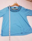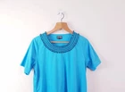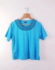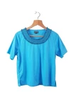 Casamia Exclusive blue T-shirt in size S/M with short sleeves. Made of polyester and viscose, this limited edition top features a basic style in a jersey fabric. Designed and manufactured in the United Kingdom, this preloved item is a stylish addition to any woman's wardrobe.