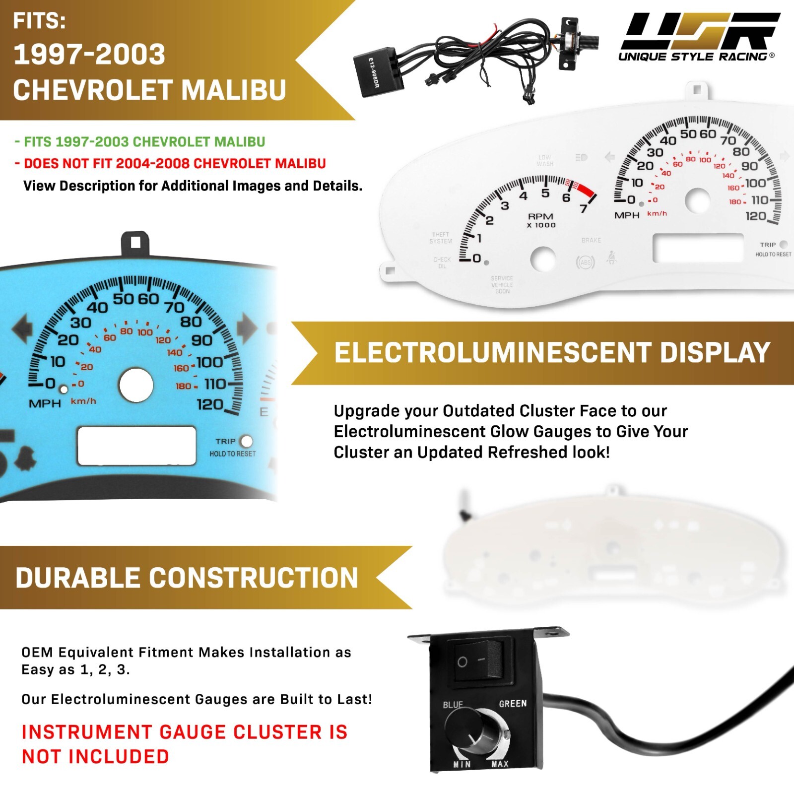 ATTENTION: For fitment and address issues, we will contact you through eBay message system first and by phone. If we are unable to get a hold of you or we cannot ship your order within 24 business hours after your order is placed, we will cancel the purchase instead. Please be sure you check product info carefully and enter your address correctly before purchase. Thank you. visit our store | View feedback | Sign up for our newsletter | Customer Support: 1-909-944-1018 Please read and understand our complete description and policies/terms below prior to buy. EL-AC001-4 DESCRIPTION Product Details: This listing is for a BRAND NEW Blue/Green Glow Gauge Overlay with an Inverter Dimmer Switch Fit for: 1997-2003 Chevy Malibu (Please always check the top speed and Redline on RPM matches between your stock instrument cluster vs. Glow Gauge set sold here) Features: * Upgrade to a more Aggressive Blue or Green Output Glow Gauge * Made by ISO2001 certified manufacturer, Excellent Quality! Specs: * Brand: Unique Style Racing (USR) * Type: Glow Gauge Overlay * Color: White Gauge Face by Day / Blue or Green Glow by Night * Surface: Non-Glare/Scratch resistant * Install Process: These gauges do not require the removal of the gauge needles for installation. Though we provide reference installation links upon request, no installation instruction will be included. In the Package: * x1 Glow Gauge Overlay Set * x1 12V Power Inverter Switch Special Note: * Though we provide reference installation link (at buyer request), we highly suggest professional installation. * WARNING: This is the Gauge FACE overlay ONLY. The entire gauge cluster is NOT included. You lay the Overlay face on top of your existing gauge cluster, as this gauge face DOES NOT replace your STOCK cluster. The Glow Gauge Overlay Face here can only worked with the 12V power inverter supplied and the 12V power inverter dimmer should NOT be connected to stock gauge cluster's own dimmer for power. Buyer's discretion is advised, please purchase the item accordingly!! Important Notes: - Although DIY is possible, CERTIFIED & LICENSED PROFESSIONAL INSTALLATION is HIGHLY SUGGESTED . - We do not provide Installation Instruction except the manufacturer's original ones if there is any. - Direct OEM STOCK Replacement - No modification needed to fit the specified years / make / models / trims. - Our Products Are SPECIFICATION SENSITIVE and we ship DOOR to DOOR ONLY. Any package being sent to "FORWARDING COMPANY" is not our responsibility. - You, as the buyer / consumer are solely responsible for all damages and losses. - We highly recommend you to buy new gaskets prior to install the product you purchased from our company since the stock ones by now should have been worn out, therefore, it is easily allowing moisture to get in and create condensation which is NOT due to the product that has leak, but bad gaskets. - Some EXCEPTIONS For Warranty Claims: A.) No visible / physical damages to the product and / or warranty is void, B.) Alteration to the product will result in termination of warranty, C.) Be sure the stock gaskets or rubber seals are not torn and worn as you will need to reuse them when you replace your stock lights with ours. You will also be asked for photos that documents any *leaking*, *misting*, *fogging up* and *condensation* issues, as well as the condition of your stock gaskets or rubber seals. and lastly, D.) All of our lighting assemblies are NOT compatible with XENON HID and LED-type bulbs. Please use either incandescent or halogen bulbs per advertisement. - Please be sure to check the provided PHOTOS, read the DESCRIPTION and ask QUESTIONS before purchase. Thank you for your business. ABOUT US We're genuine and honest sellers and we carry great selection of the quality products to choose from, at a competitive pricing. Every order is carefully packaged and inspected by three of our staff using the latest technology to ensure safe shipment to you. We value good relationship with our customers and if you have any question or concerns regarding a sale, please do feel free to contact us first. Please do check your ebay message often for your order status, we will contact you for any delay that is caused by the payment or shipping complication arises from processing your order. We hope you enjoy your purchase! PAYMENT We accept payment by: Paypal. We accept PAYPAL only at this moment for all ebay transactions and MUST ship to paypal's listed address. 1.) If you are using eBay?s checkout system, please ensure that your registration information is current and will match what you have on PayPal. We will not be able to accommodate to change the original address we receive at the time of payment with an alternative one, once the transaction is completed via eBay and PayPal. 2.) We are required to ship to the address attached to your payment only. 3.) We will not be able to ship to an alternative address besides the original address shown on your PayPal payment detailed page. 4.) Please DO read and understand the policies / terms prior to buy to avoid any future discrepancy from occurring. Thank you for your cooperation! SHIPPING Please read and understand our complete policies/terms below or ask question if you have concerns prior to buy. 1.) Free shipping only applies to the listings that have the ?Free Shipping? icon displayed and for completed transactions. Any canceled, incomplete, refused or undeliverable packages are subjected to a 20% re-stocking fee + all shipping related fees. 2.) Shipping costs incurred are non-refundable under any circumstance. Shipping costs are incurred and paid to the shipping courier and they are not refundable. 3.) We DO NOT ship to APO / FPO, GUAM, MP, PUERTO RICO (PR) and VIRGIN ISLAND (VI) 4.) INTERNATIONAL COUNTRIES: Buyer is responsible for all Brokerage Fees, Taxes & Duties - which may be charged upon delivery. Please contact your local shipping agent to determine your estimated taxes & duties. 5.) Pick up 